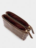 Bolso bandolera pequeño y doble con tachuelas. Forro y bolsillo interior. Cierre de cremallera. Efecto craquelado. Asa ajustable y extraíble.