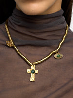 Collar corto de cuentas cuadradas. Pendientes con efecto martillado y envejecido; detalle de piedras. Cierre de mosquetón. Acabado dorado.