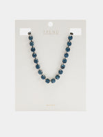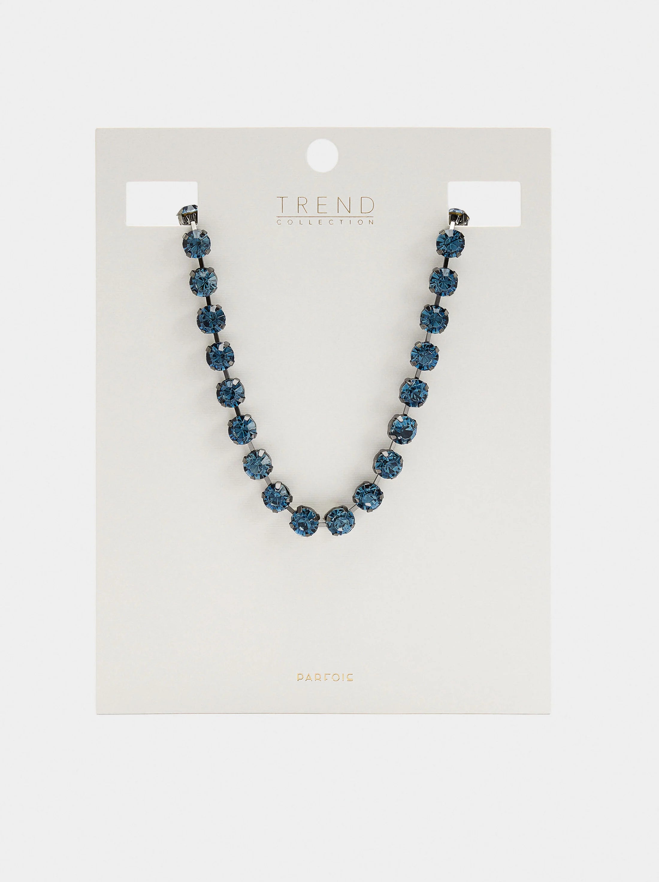 Collar corto con cristales azules facetados. Acabado plateado oscurecido.