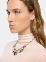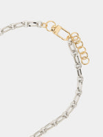 Collar corto de eslabones bicolor. Colgantes de diversas formas y tamaños con esmalte. Acabado dorado y plateado.