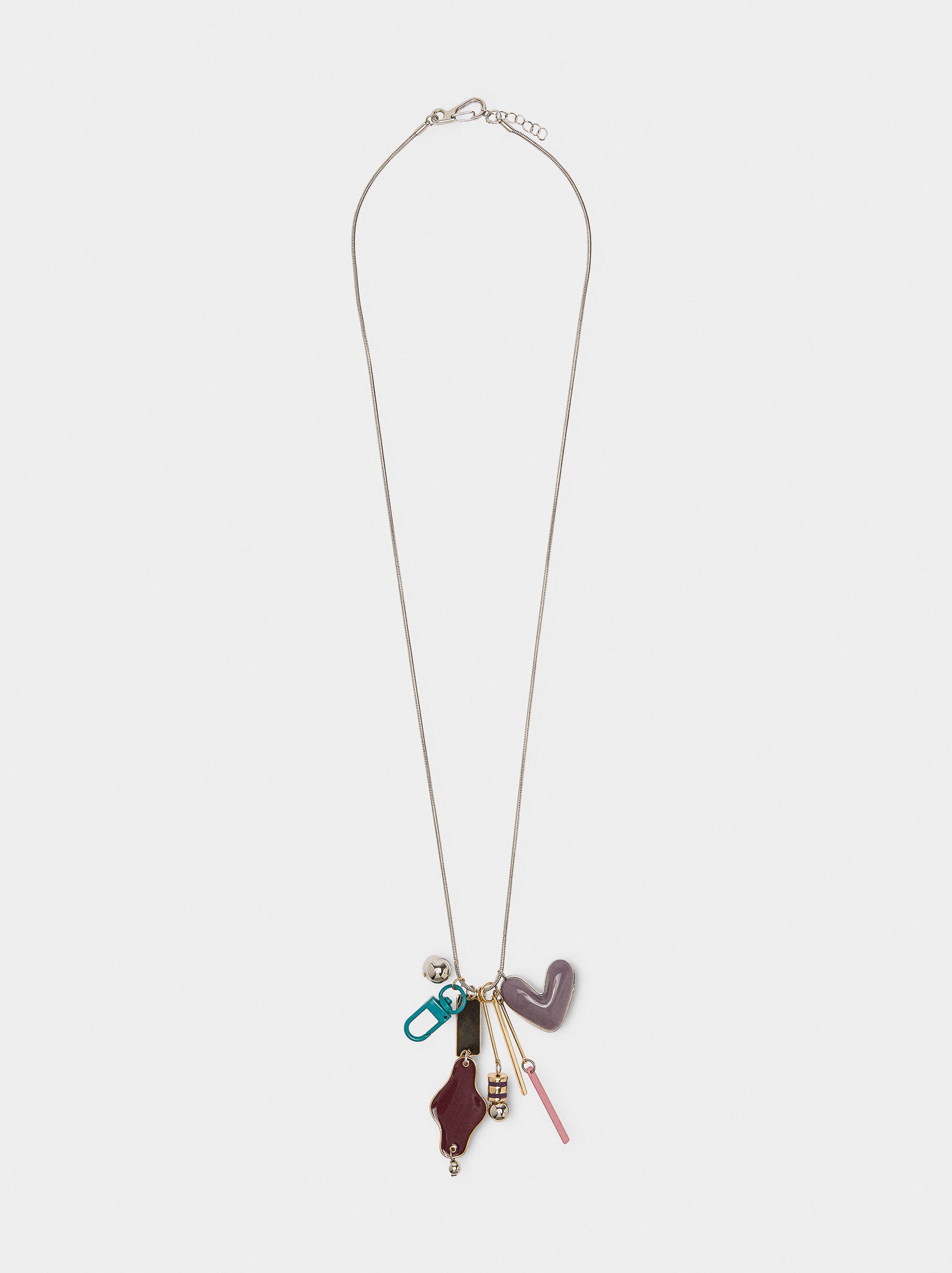 Collar largo de cadena de serpiente. Colgantes en forma de corazón, barras y esferas con esmalte. Cierre de mosquetón. Acabado dorado y plateado.
