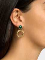 Pendientes de tamaño medio en forma de media esfera de piedra. Colgante en forma de aro irregular. Efecto envejecido. Acabado dorado.