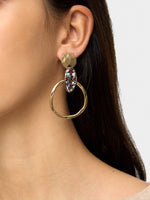 Pendientes largos con detalle étnico multicolor, hecho de conchas, resina y arcilla. Colgante en forma de aro. Efecto envejecido. Acabado dorado.