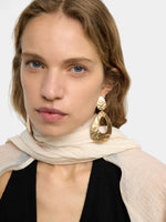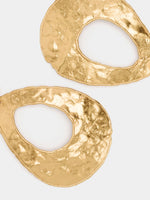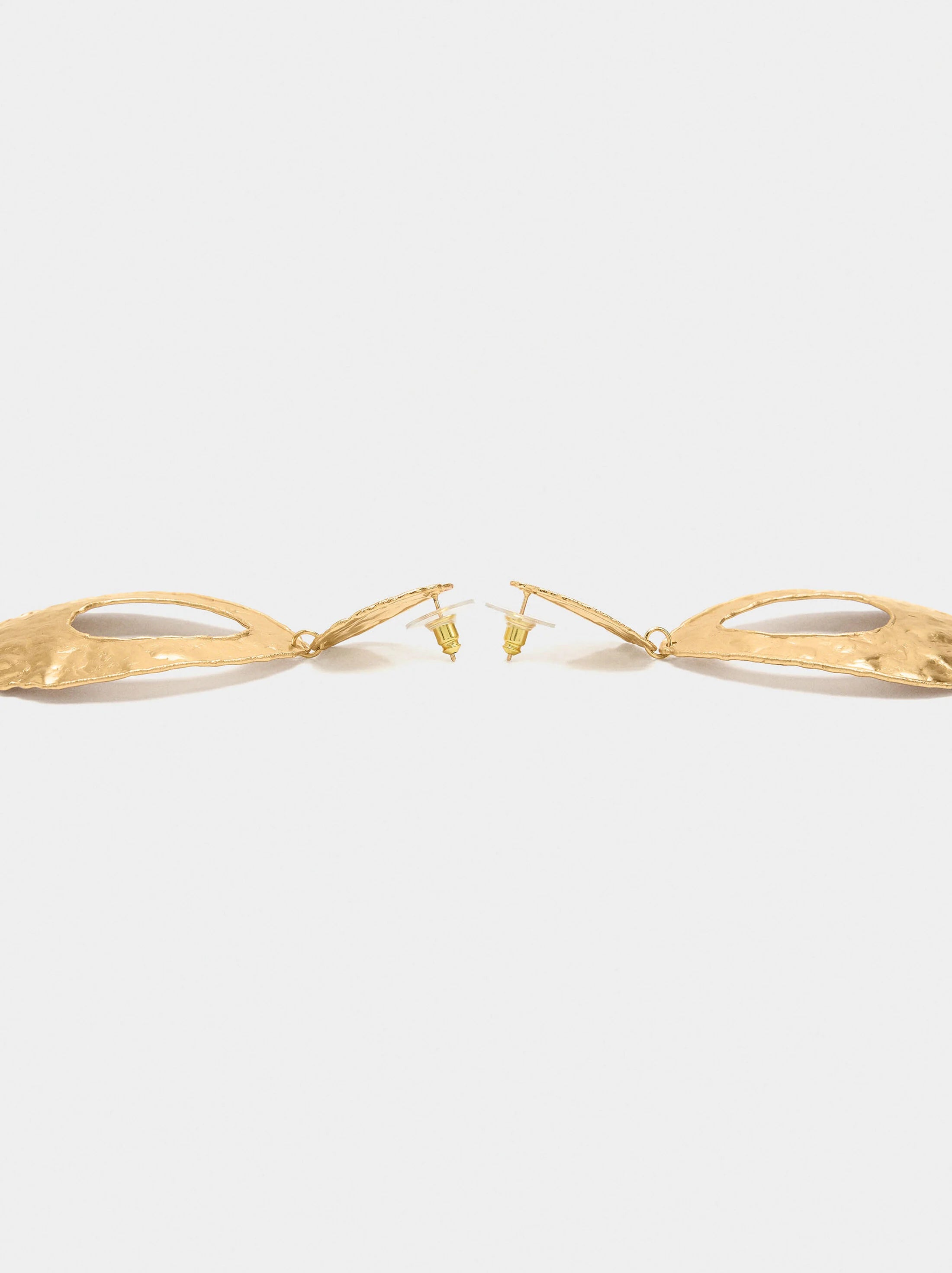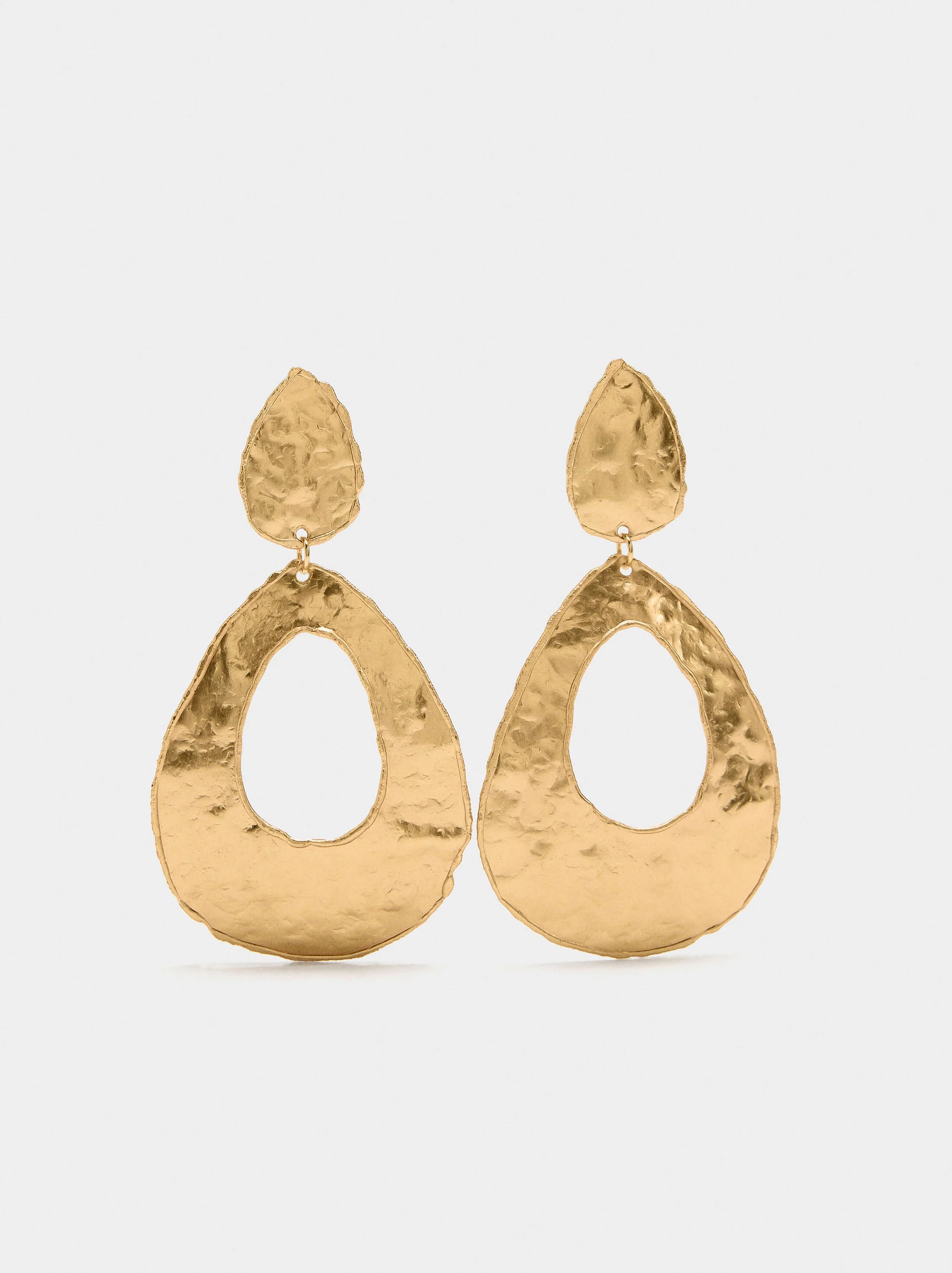 Pendientes maxi de forma ovalada con perforación. Base en forma de lágrima. Efecto martillado y envejecido. Acabado dorado.