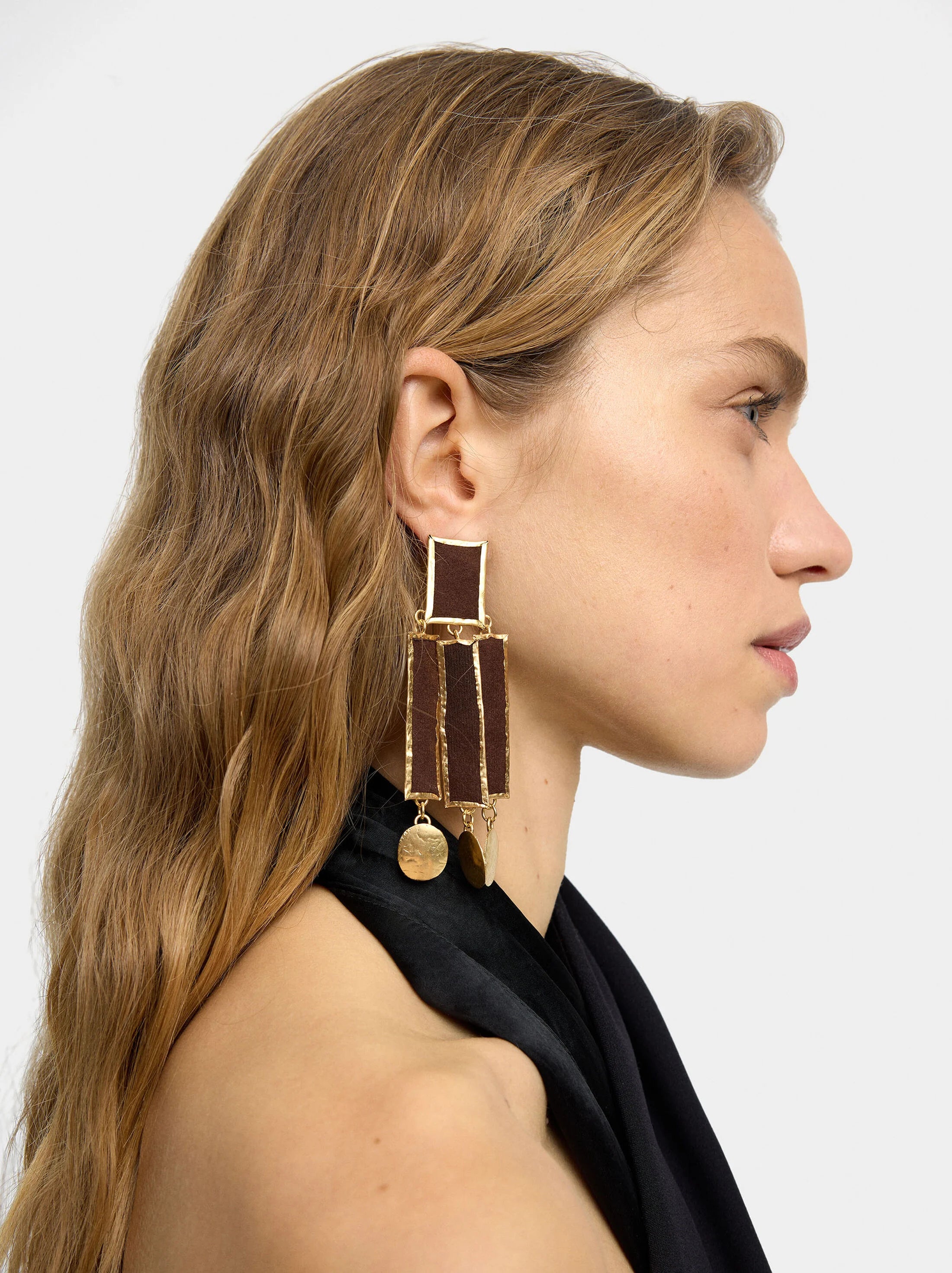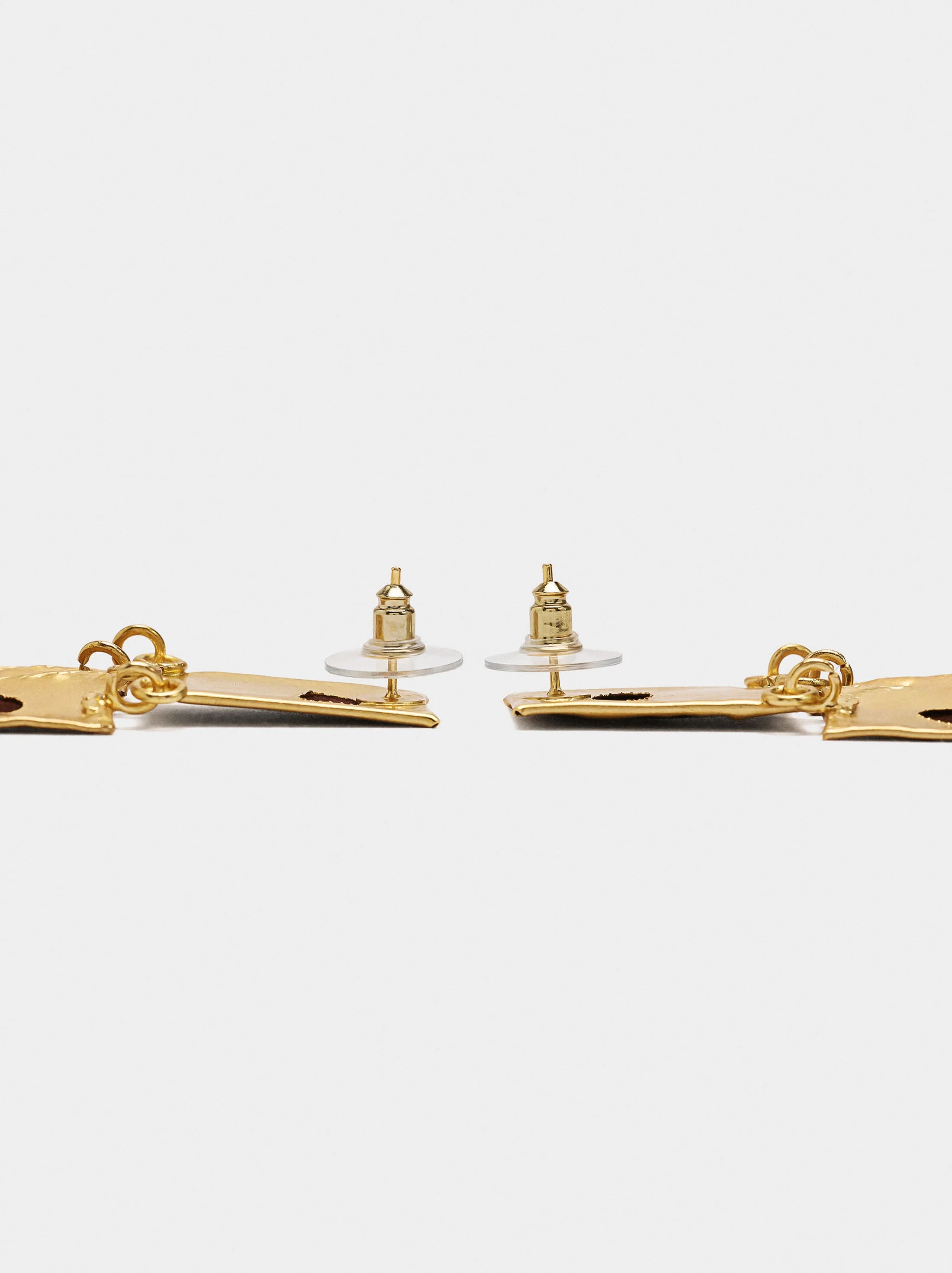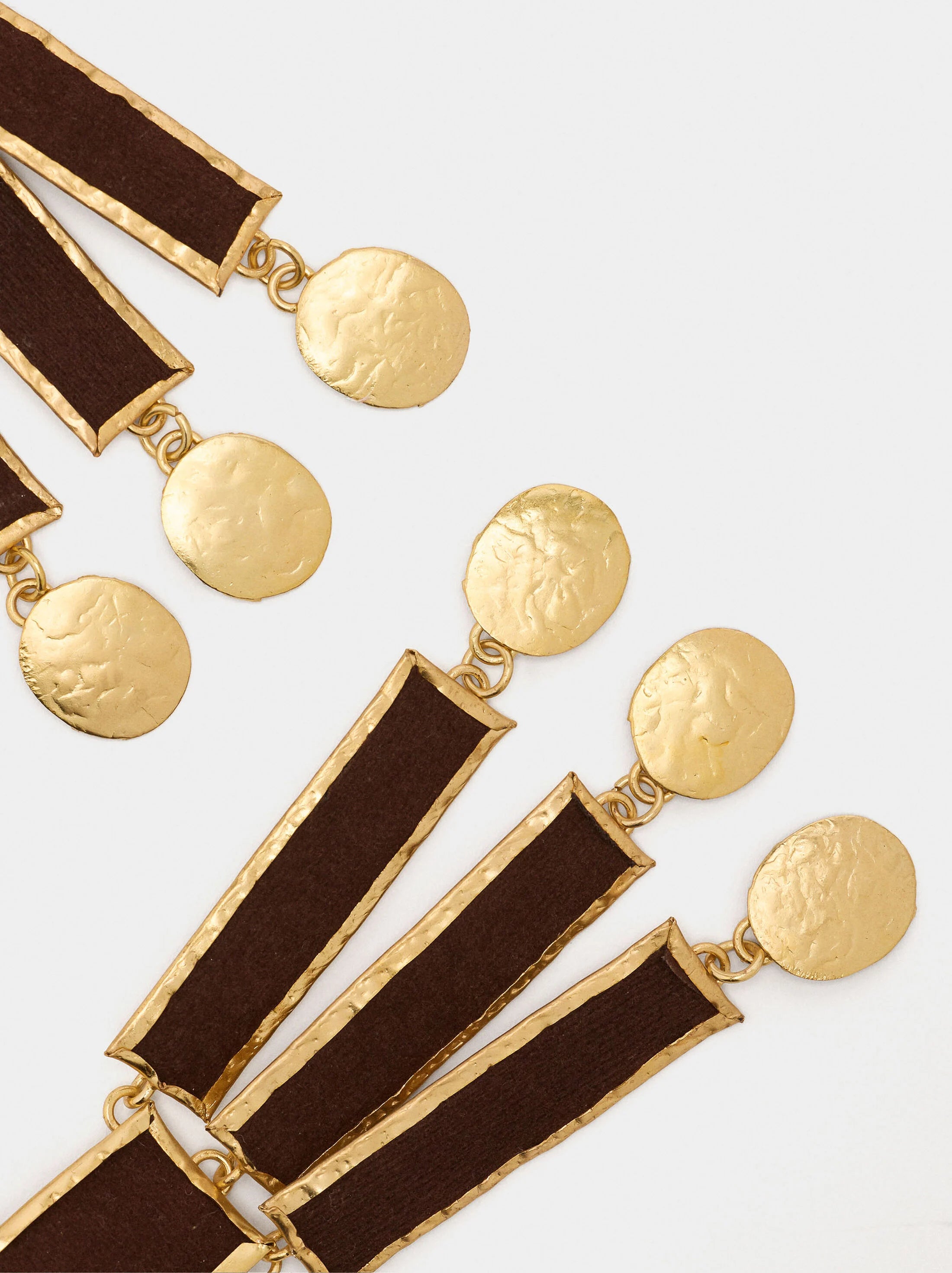Pendientes maxi con base rectangular y barras de tela con bordes metálicos y medallas en las extremidades inferiores. Efecto martillado y efecto envejecido. Acabado dorado.