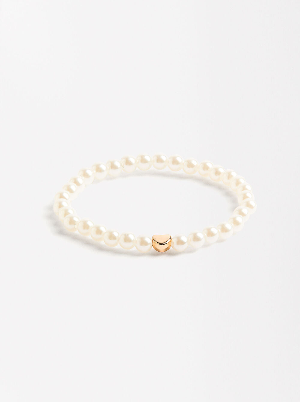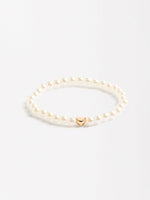 Pulsera elástica con perlas y corazón con acabado dorado.