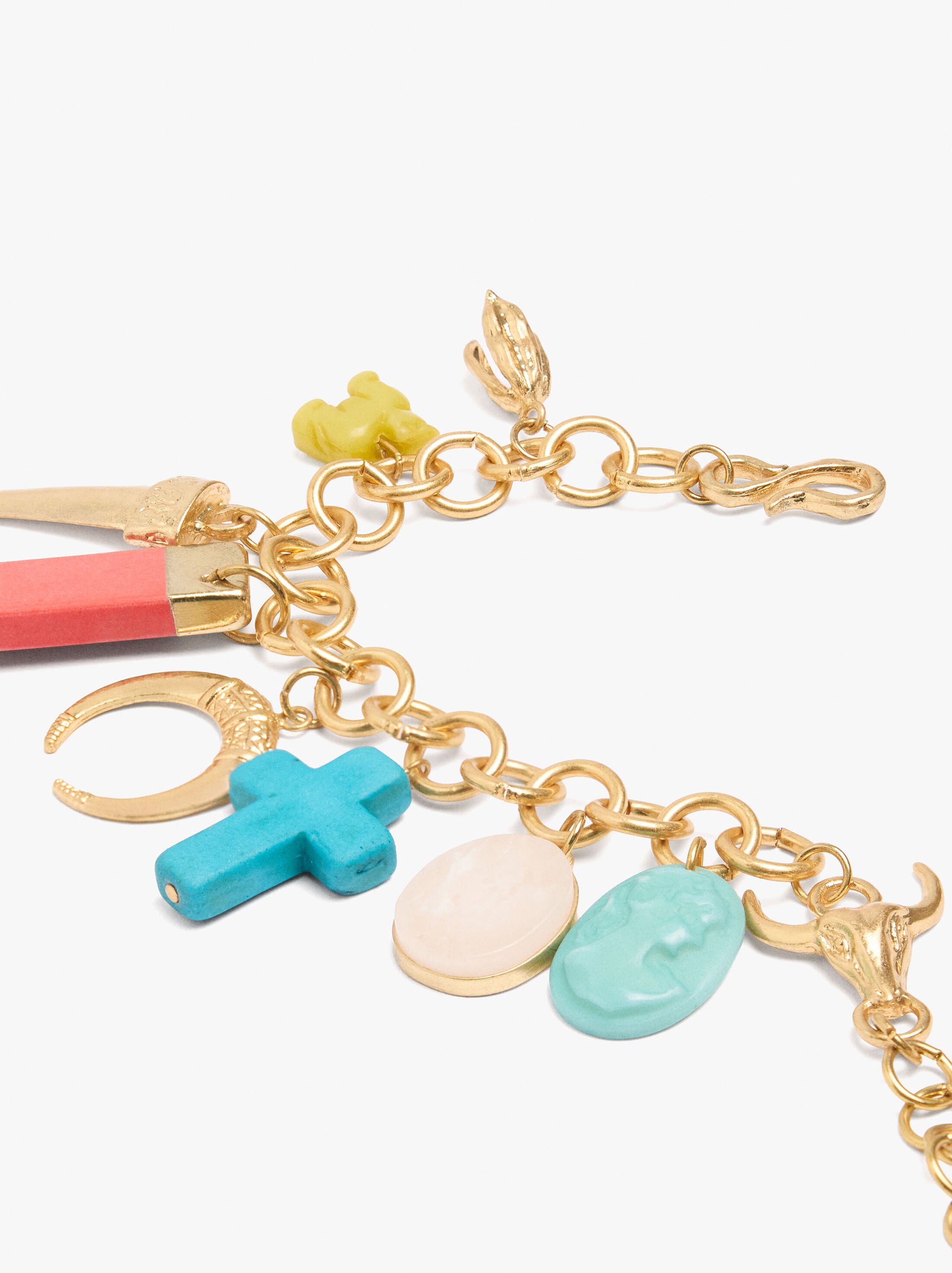 Pulsera de eslabones con colgantes de diversos colores, tamaño y formas en piedra y resina. Detalle de cruz y elefante. Cierre de mosquetón. Acabado dorado.
