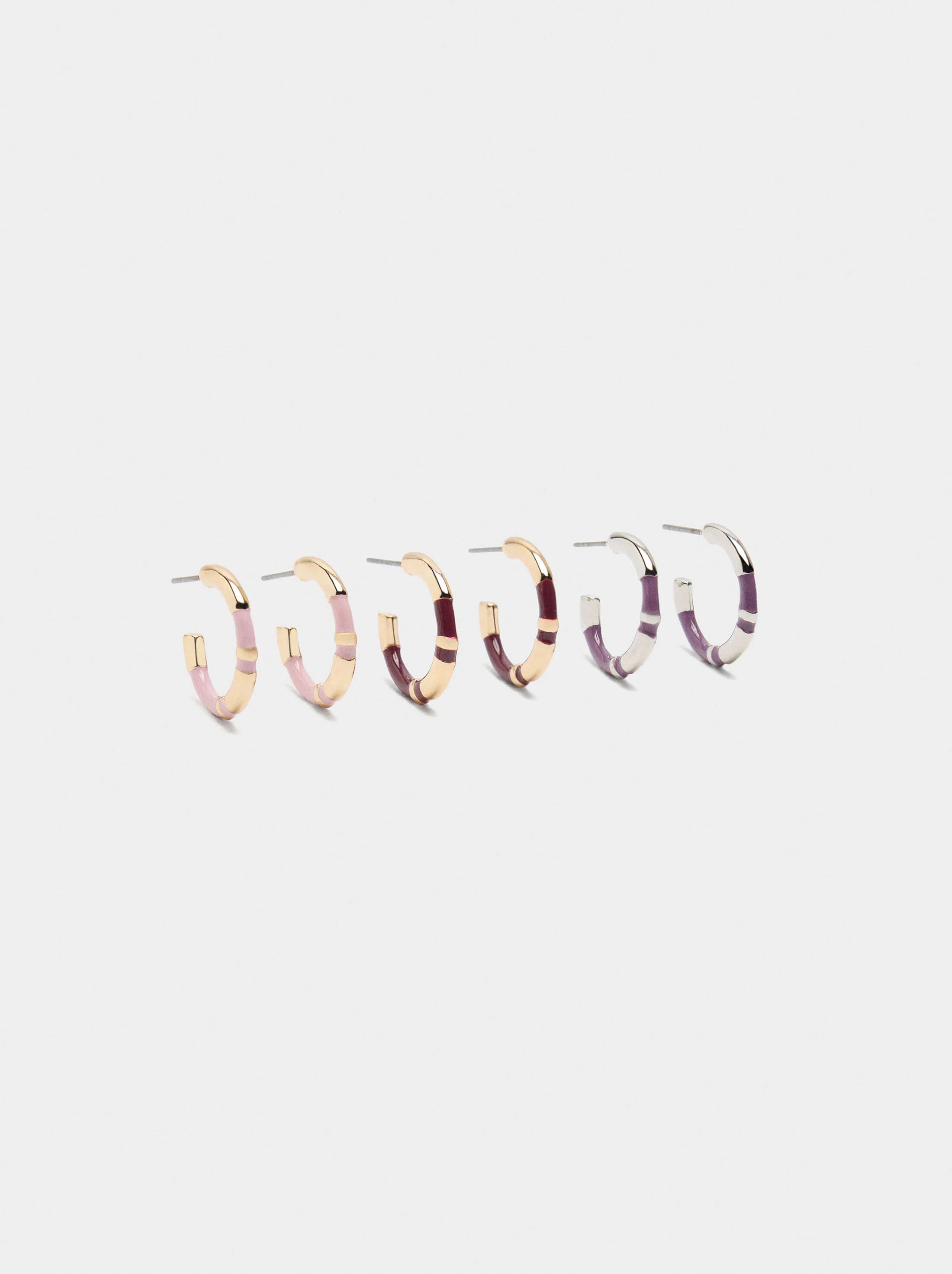 Set de tres pares de aros abiertos bicolor con detalles de esmalte. Acabado dorado y plateado.