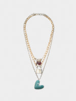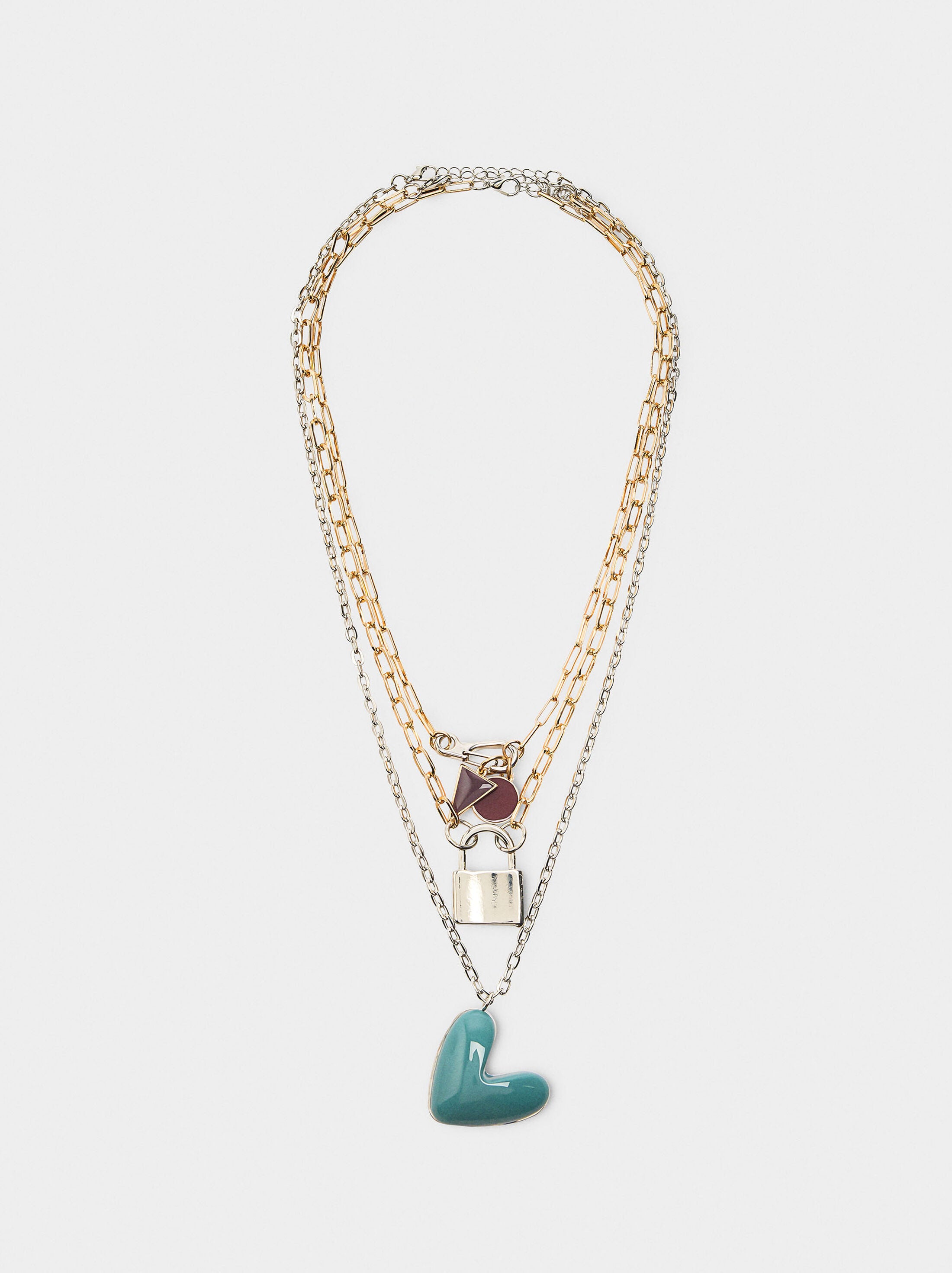Set de tres collares bicolor de eslabones con colgantes de formas geométricas, candado y corazón con esmalte. Acabado dorado y plateado.
