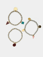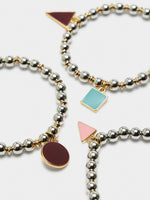 Set de tres pulseras elásticas con cuentas bicolor. Charms de diferentes tamaños con esmalte. Acabado plateado y dorado.