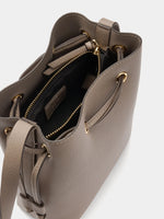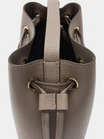 Bolso bandolera con textura. Tamaño mediano. Forro y bolsillo interior. Compartimento central con cierre de cremallera. Cierre con cordón para fruncido. Asa fija ajustable.
