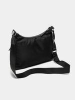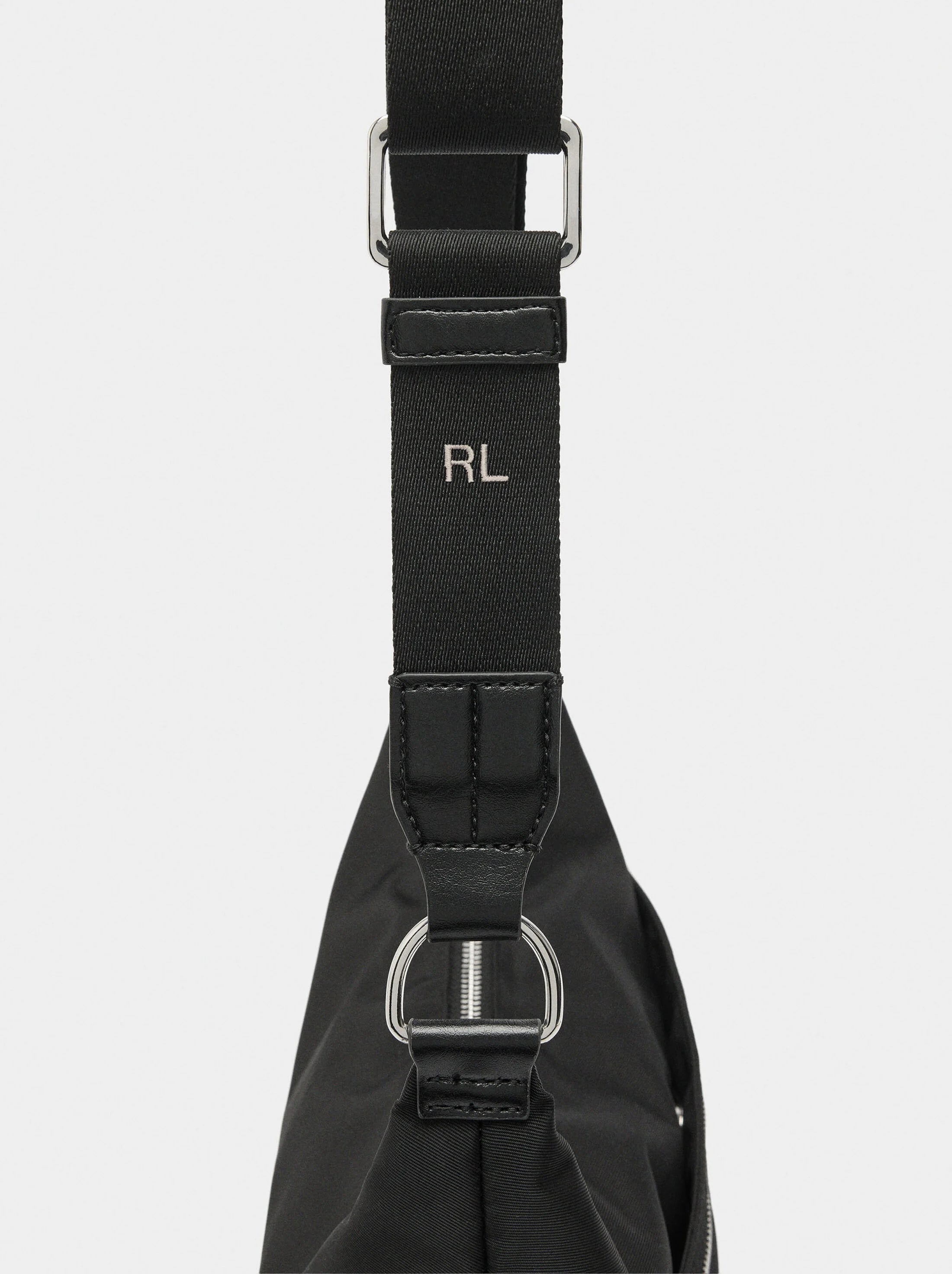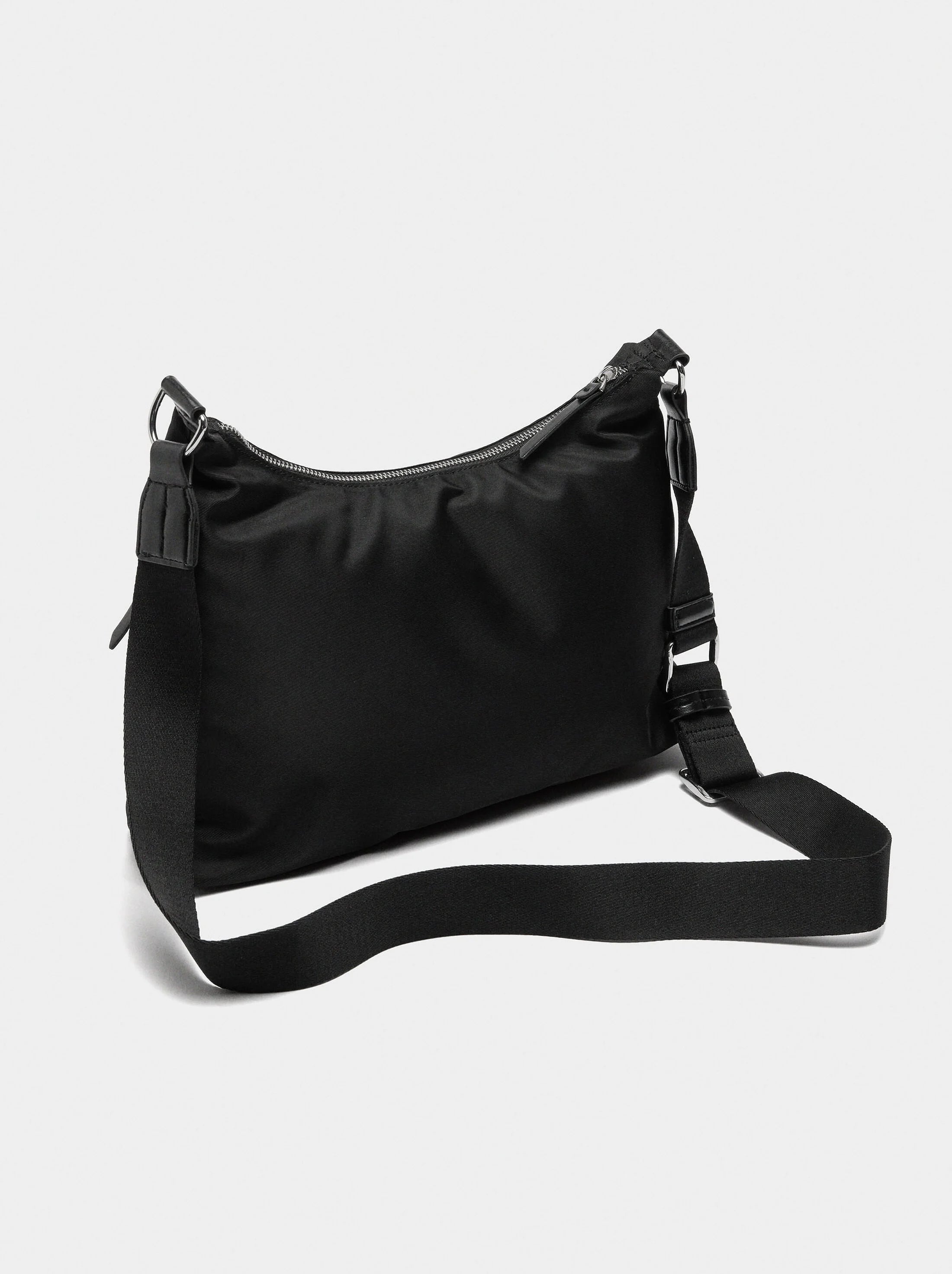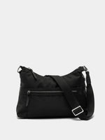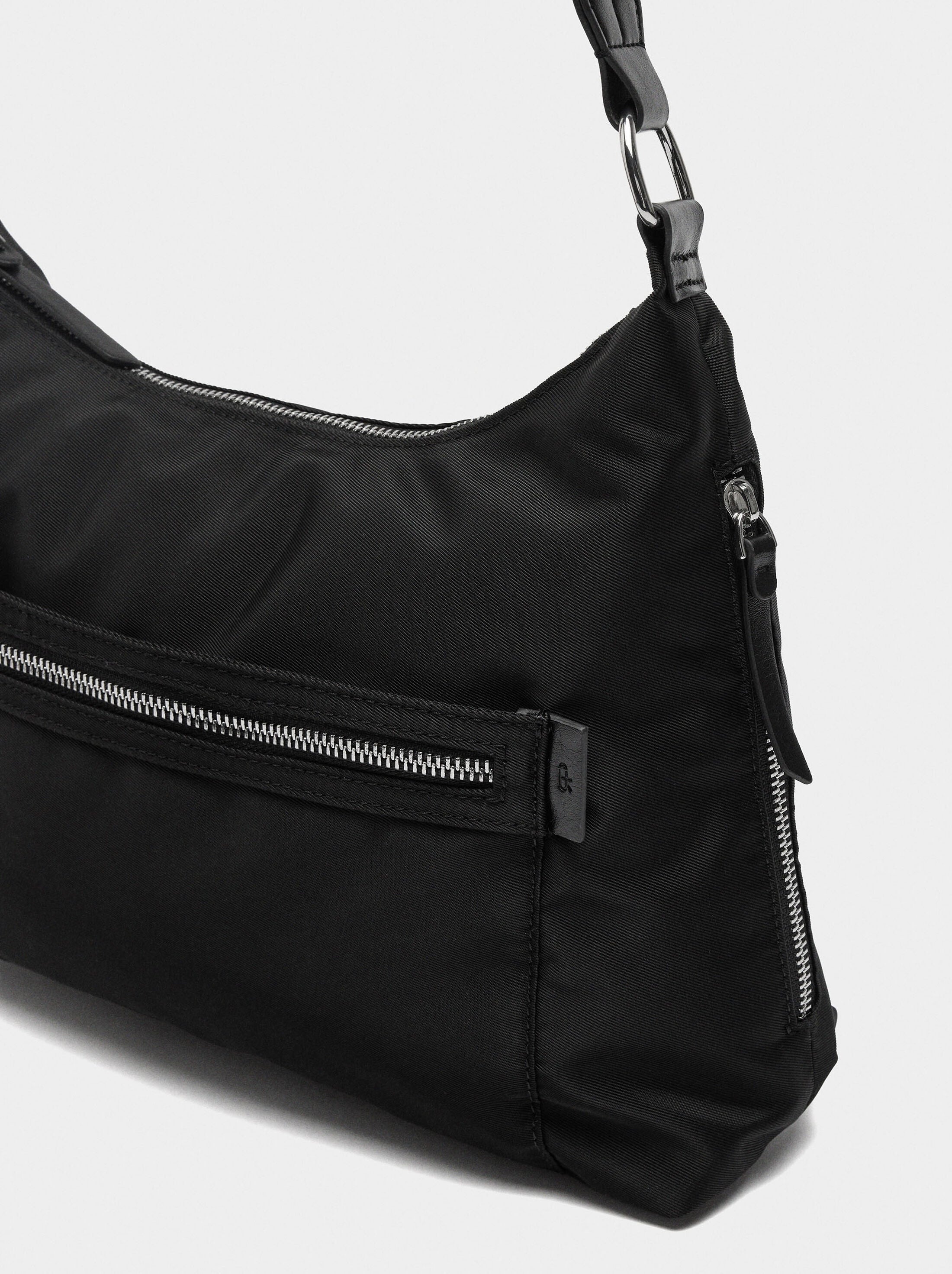 Bolso bandolera estilo hobo de nylon. Forro y bolsillo interior. Bolsillos exteriores con cierre de cremallera. Asa fija ajustable. Personalizable.