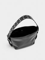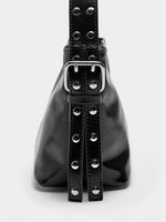 Bolso bombonera pequeño. Forro y bolsillo interior. Cierre de imán. Asa fija ajustable, con tachuelas.