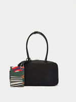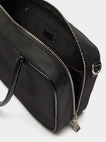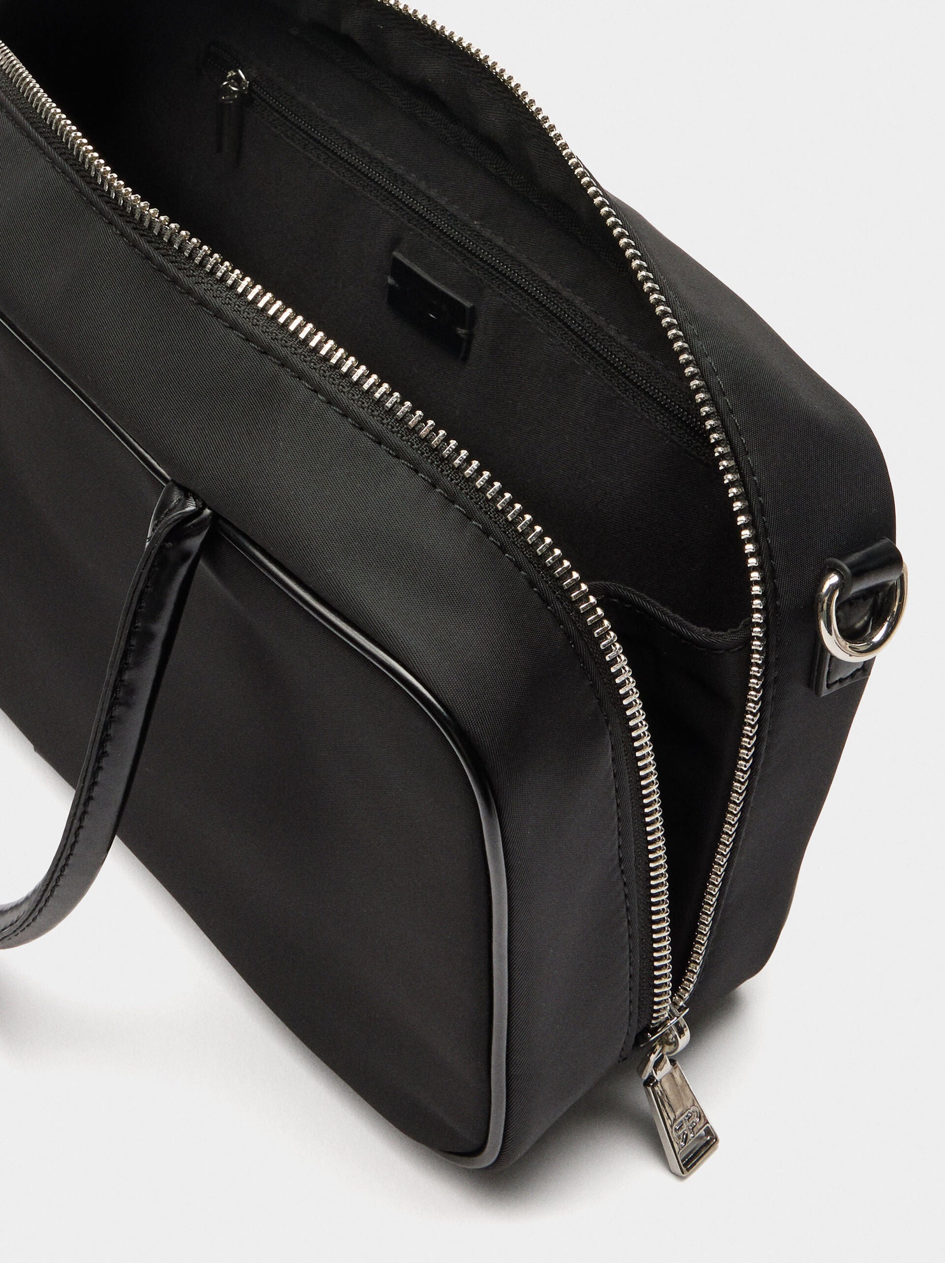 Bolso bowling de nylon con colgante estampado extraíble. Tamaño mediano. Forro y bolsillo interior. Cierre de cremallera. Asas fijas. Incluye bandolera ajustable y extraíble.