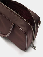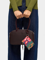 Bolso bowling de nylon con colgante estampado extraíble. Tamaño mediano. Forro y bolsillo interior. Cierre de cremallera. Asas fijas. Incluye bandolera ajustable y extraíble.