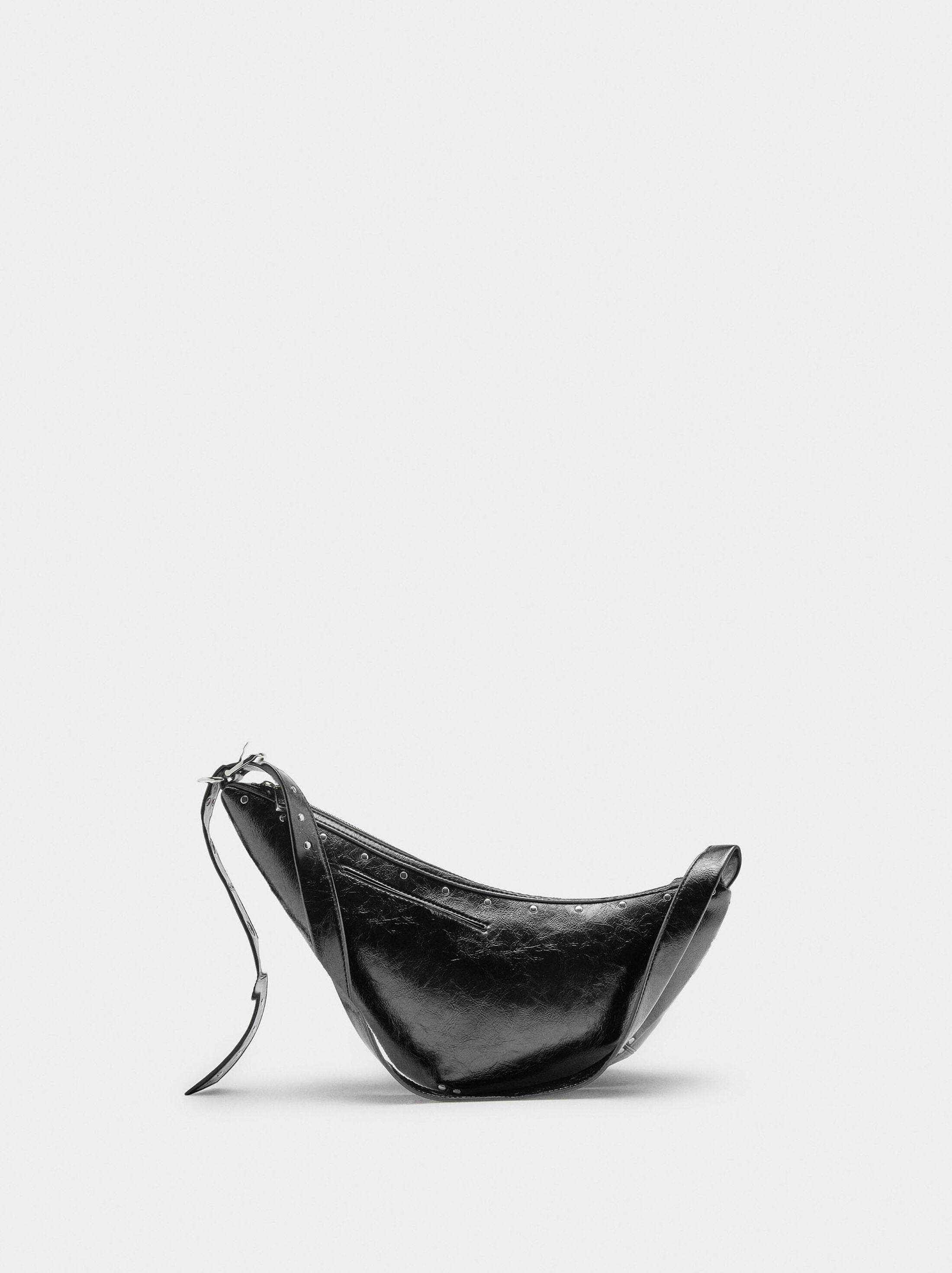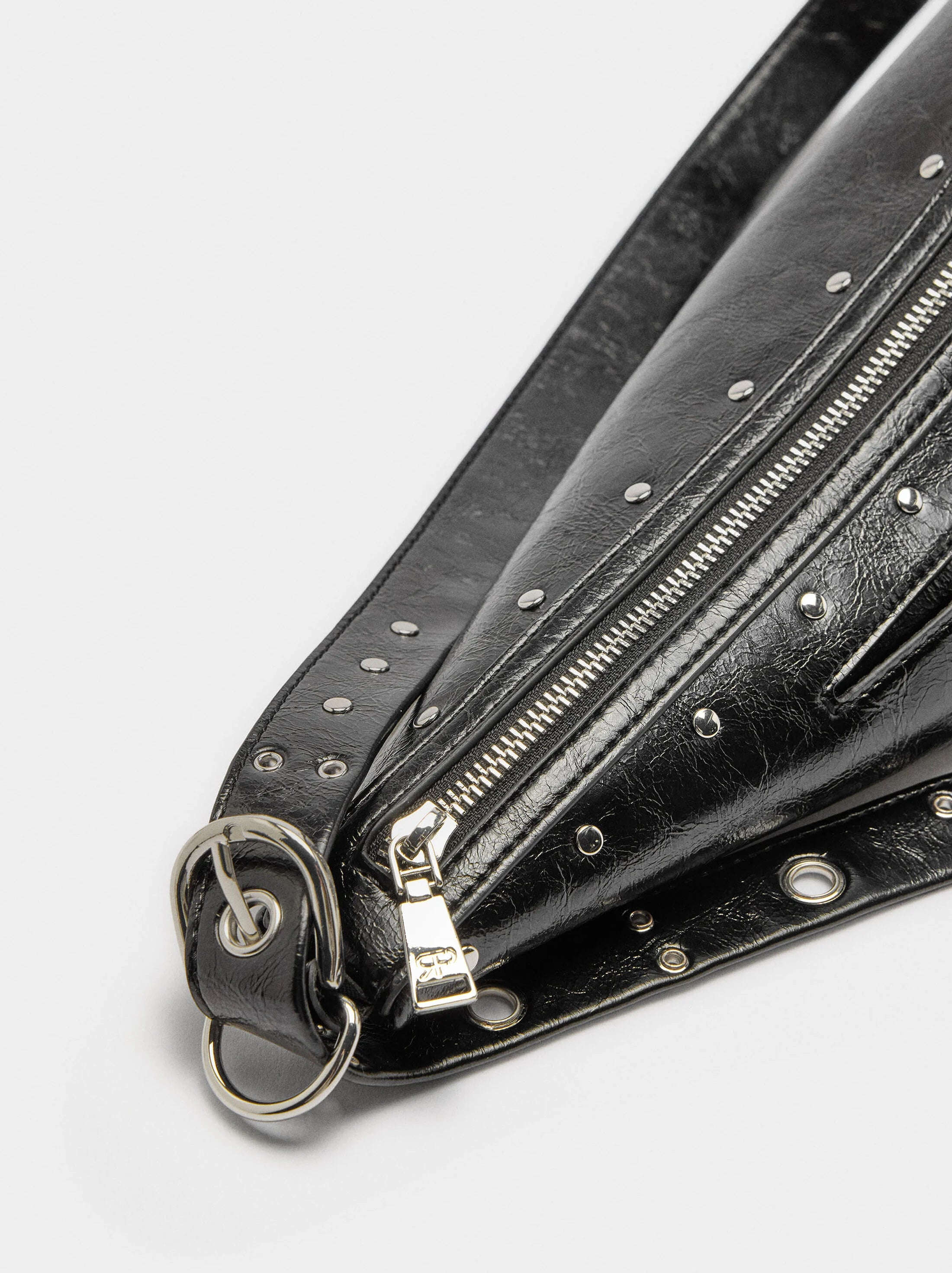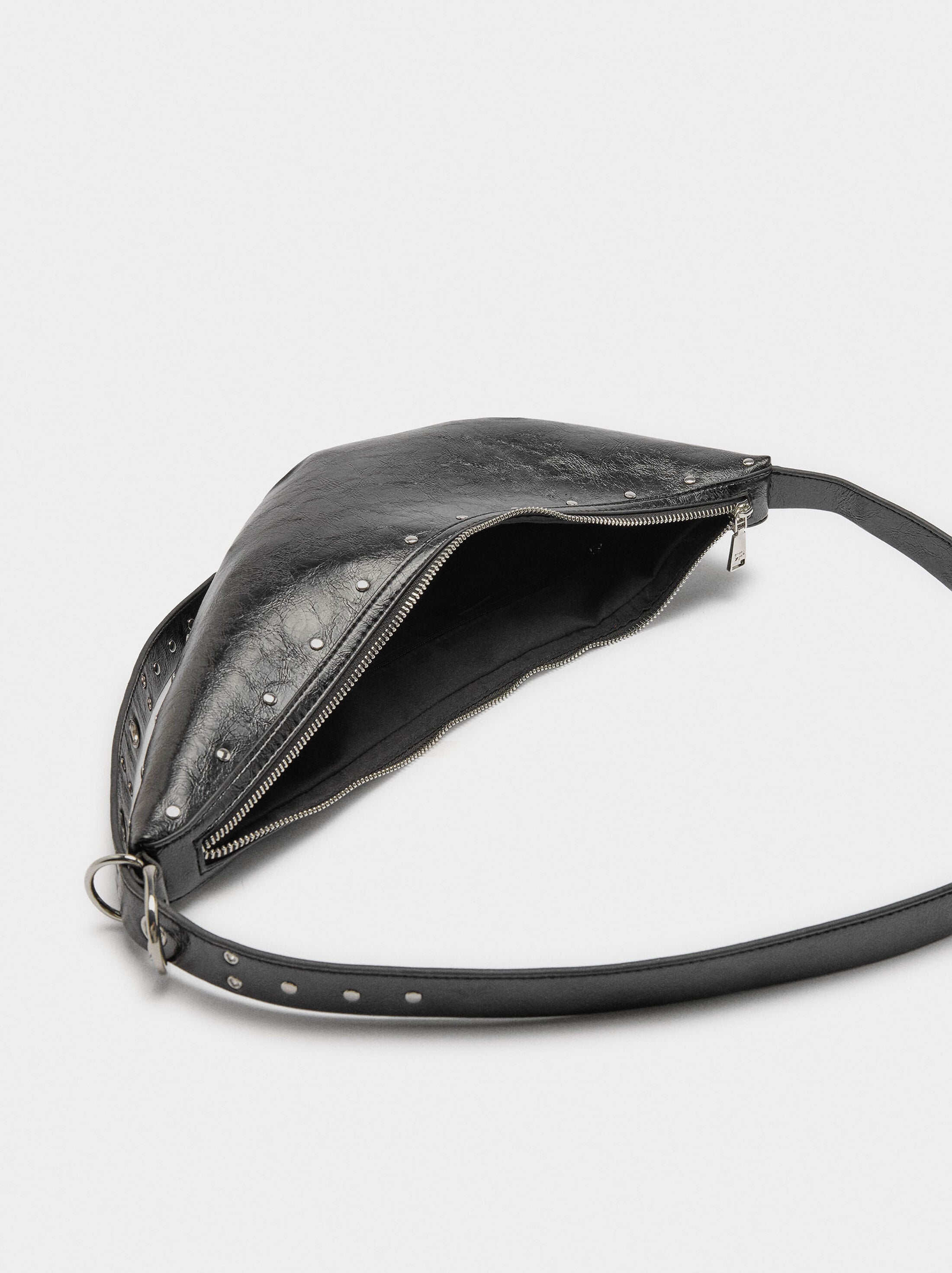 Bolso de hombro asimétrico con tachuelas. Estilo hobo. Efecto craquelado brillante. Forro y bolsillo interior. Cierre de cremallera. Asa fija y ajustable.