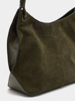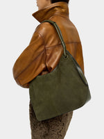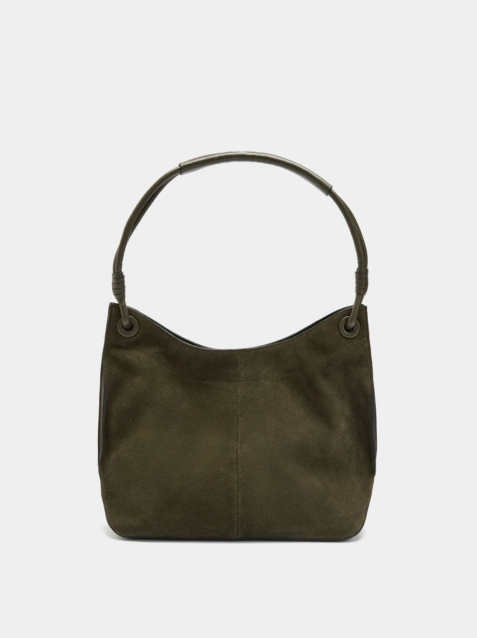 Bolso de hombro grande con detalles de piel. Costuras marcadas en la parte delantera. Forro y bolsillo interior. Cierre de imán. Asa fija.