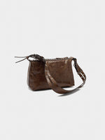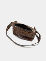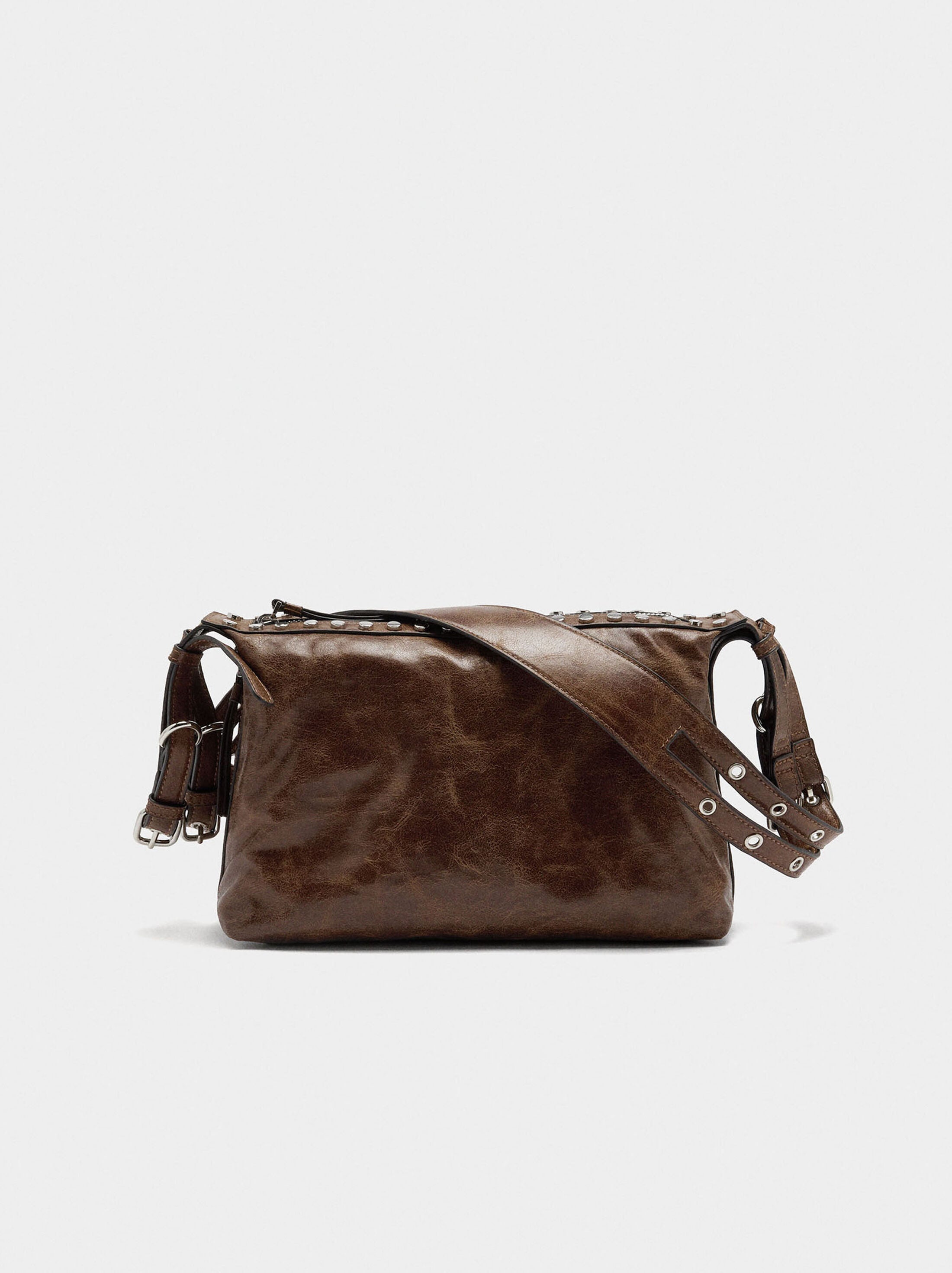 Bolso de hombro con tachuelas. Tamaño mediano. Efecto craquelado. Forro y bolsillo interior. Cierre de cremallera. Asas fijas y ajustables.
