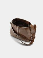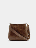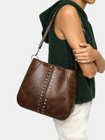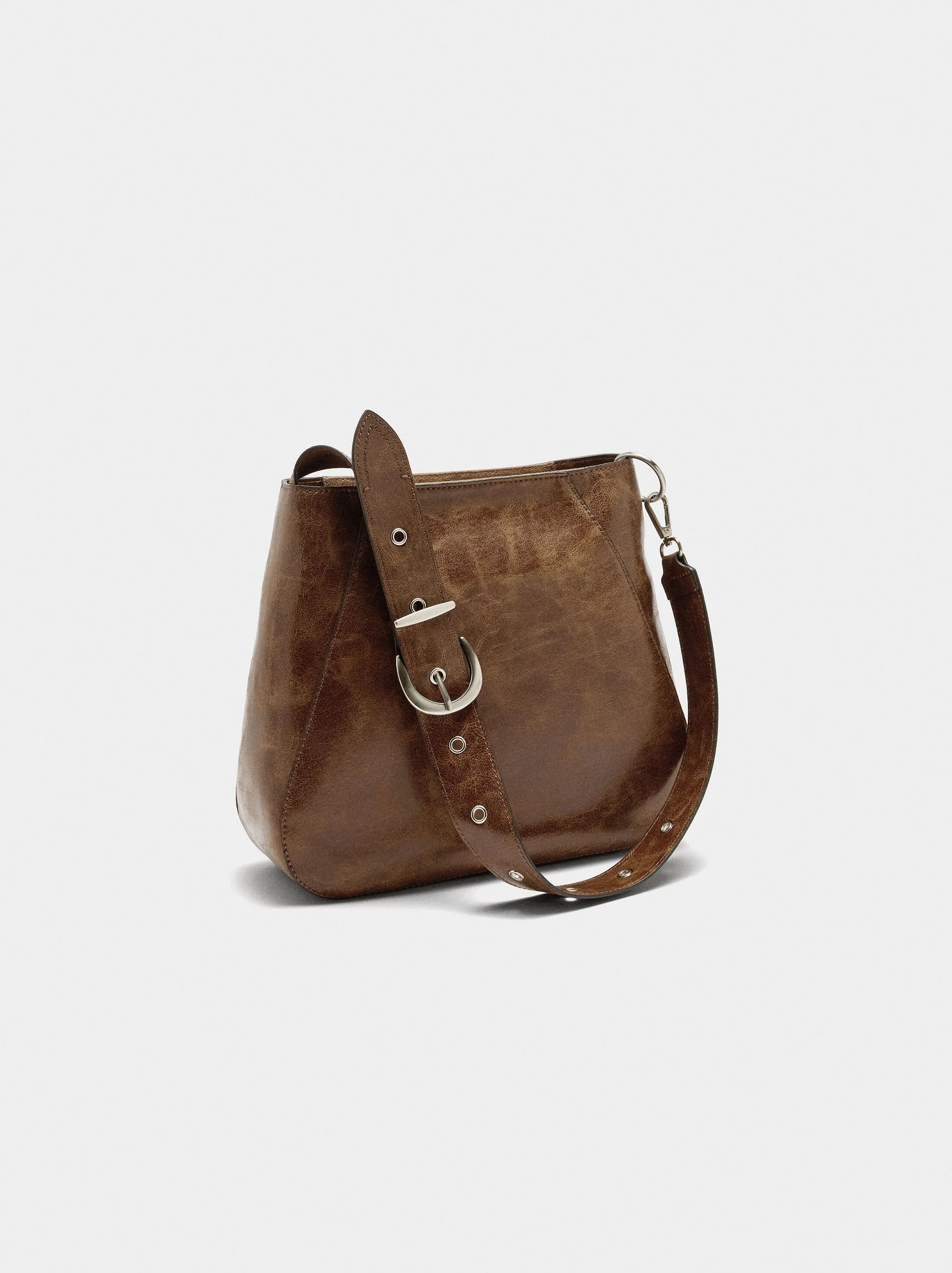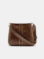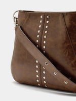 Bolso de hombro con tachuelas. Tamaño mediano. Costuras marcadas. Forro y bolsillo interior. Cierre de cremallera. Asa fija ajustable.