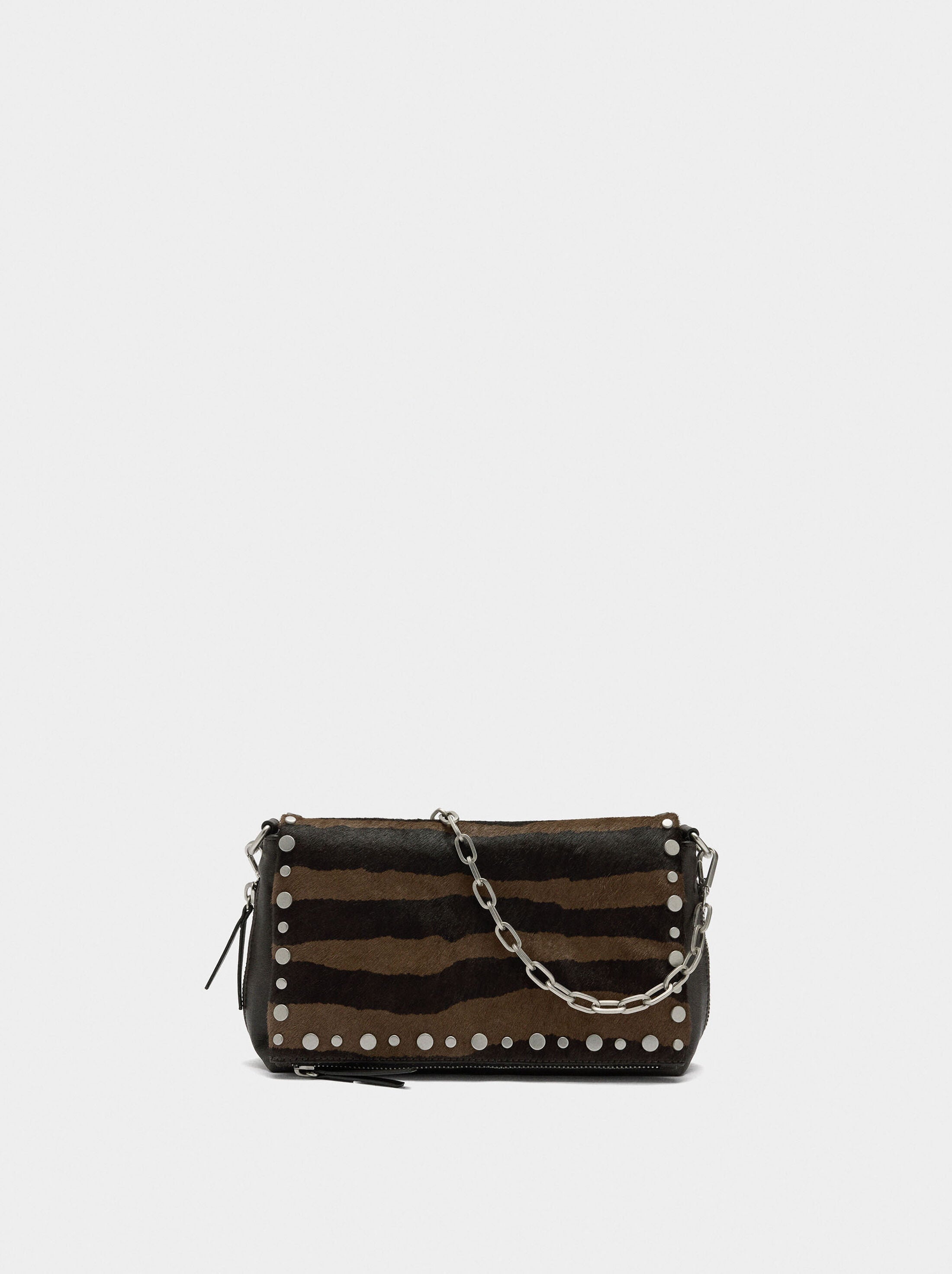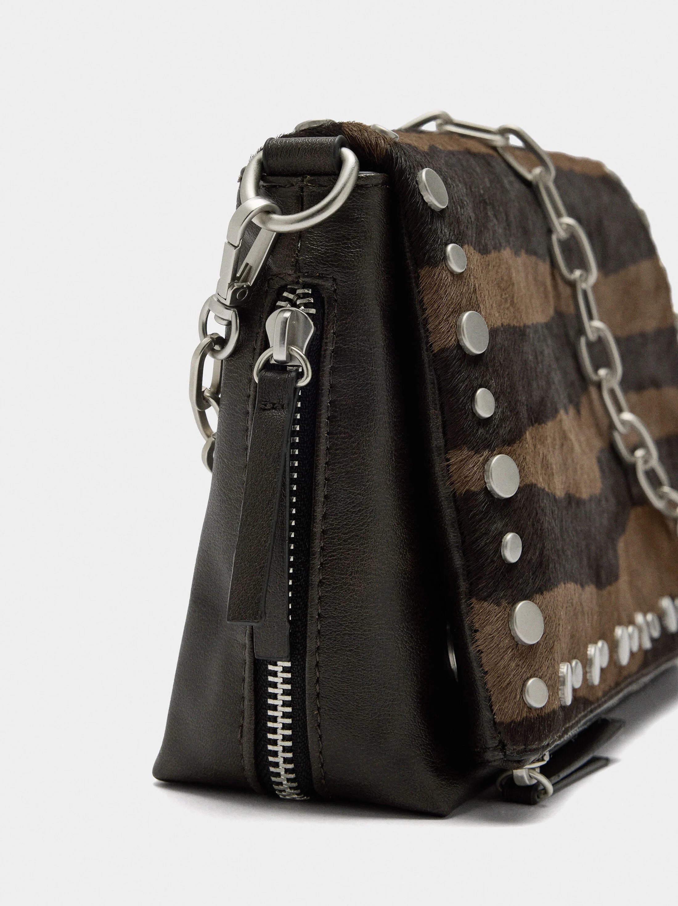 Bolso de hombro con detalles de piel y tachuelas. Extensible con cierre de cremallera. Cierre de solapa imantado con cierre de cremallera. Forro interior. Bolsillo exterior en la parte posterior. Asa bandolera ajustable y extraíble. Incluye asa de cadena.