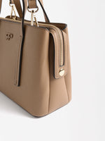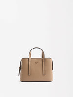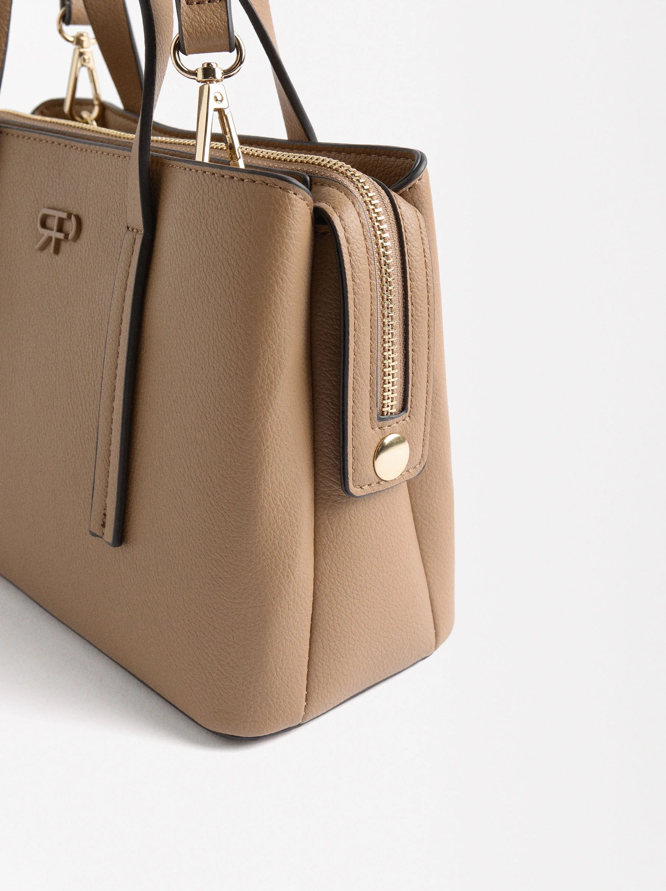 Bolso tote pequeño con textura. División central con forro y bolsillo interior; cierre de cremallera. Compartimentos laterales con cierre de imán. Asas de mano fijas. Tirante bandolera ajustable y extraíble.