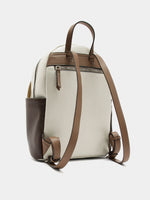 Mochila básica color block con textura. Tamaño grande. Bolsillos exteriores en la parte delantera y posterior con cierre de cremallera. Asa de mano fija. Asas posteriores fijas y ajustables.