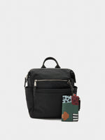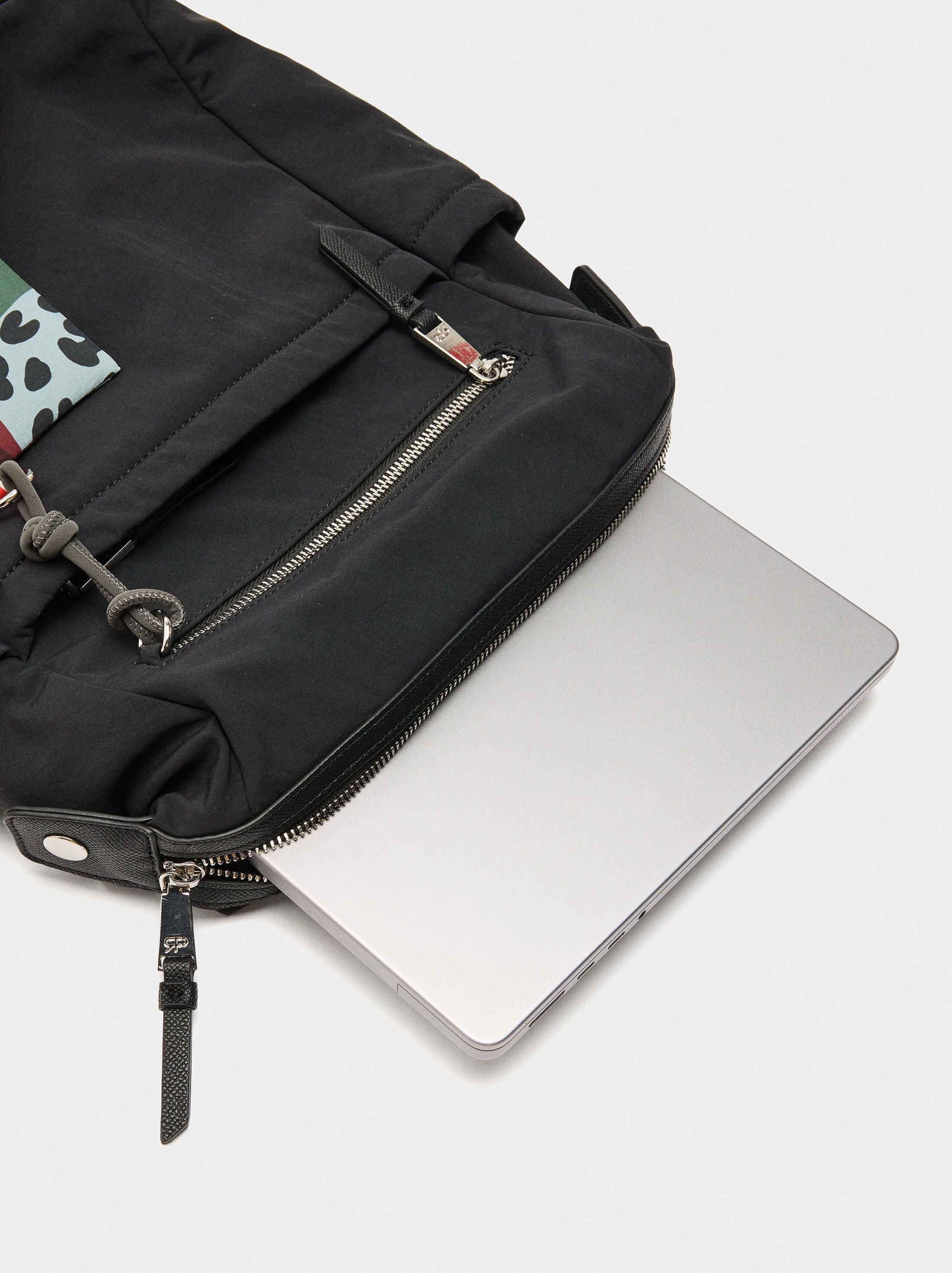 Mochila de nylon para portátil de 13". Penduro extraíble y con cierre de cremallera. Forro y bolsillo interior. Bolsillos exteriores en la parte delantera, posterior y en los laterales. Asa de mano fija. Asas posteriores ajustables.