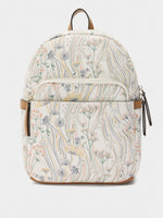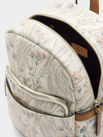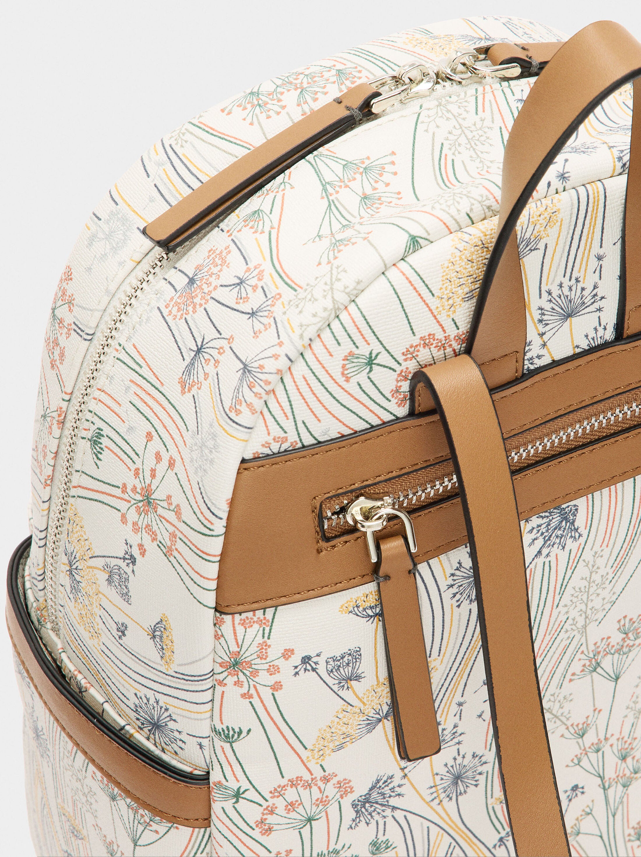 Mochila básica con estampado floral. Tamaño grande. Forro y bolsillo interior. Bolsillos exteriores y traseros con cierre de cremallera. Abertura principal con cierre de cremallera. Asa de mano fija. Asas traseras fijas, ajustables y desmontables.