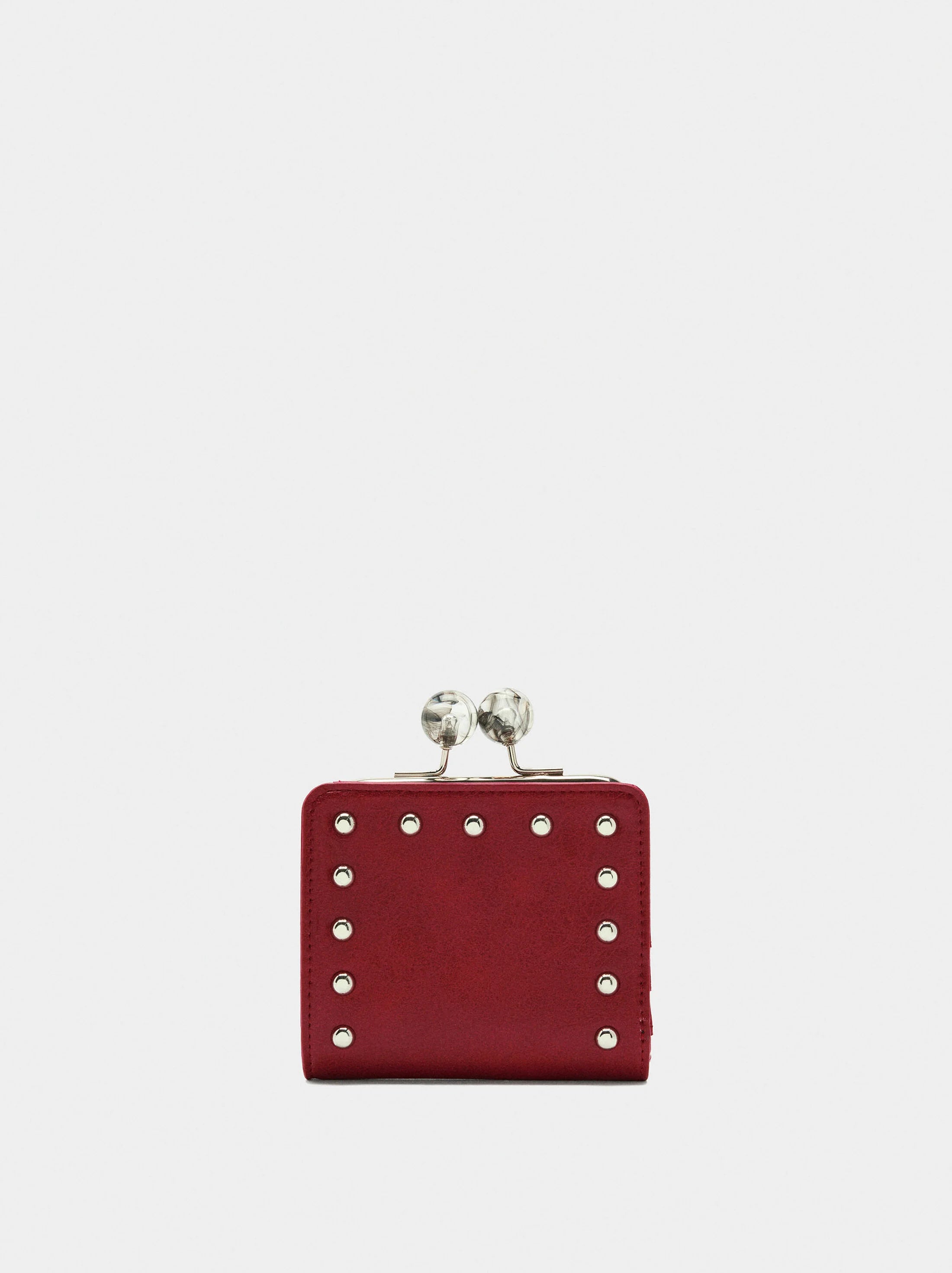 Cartera pequeña con tachuelas y efecto craquelado. Ranuras para tarjetas y billetes. Compartimento con cierre de boquilla y detalle de esferas. Cierre principal con cierre con botones de presión.