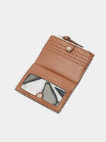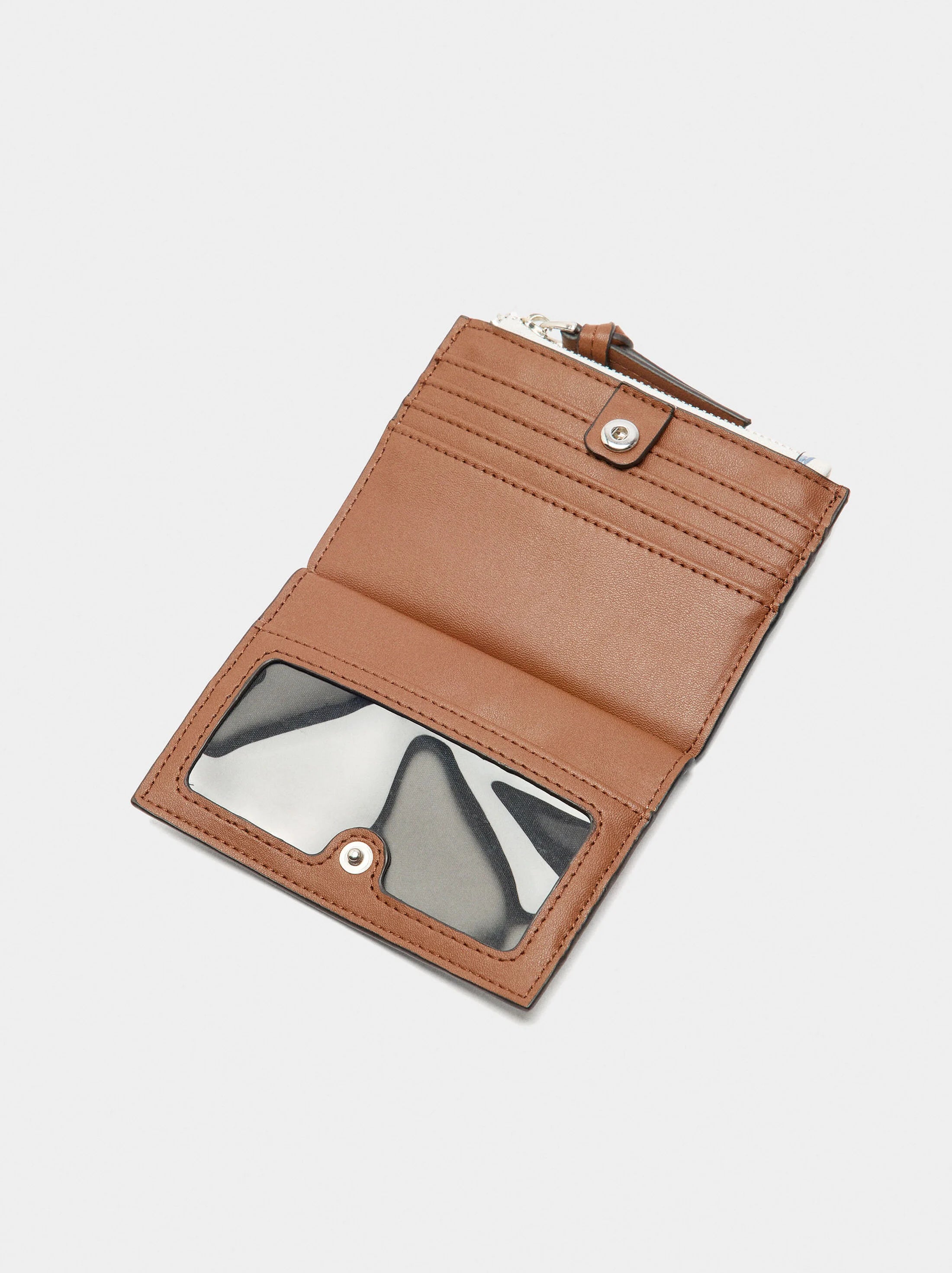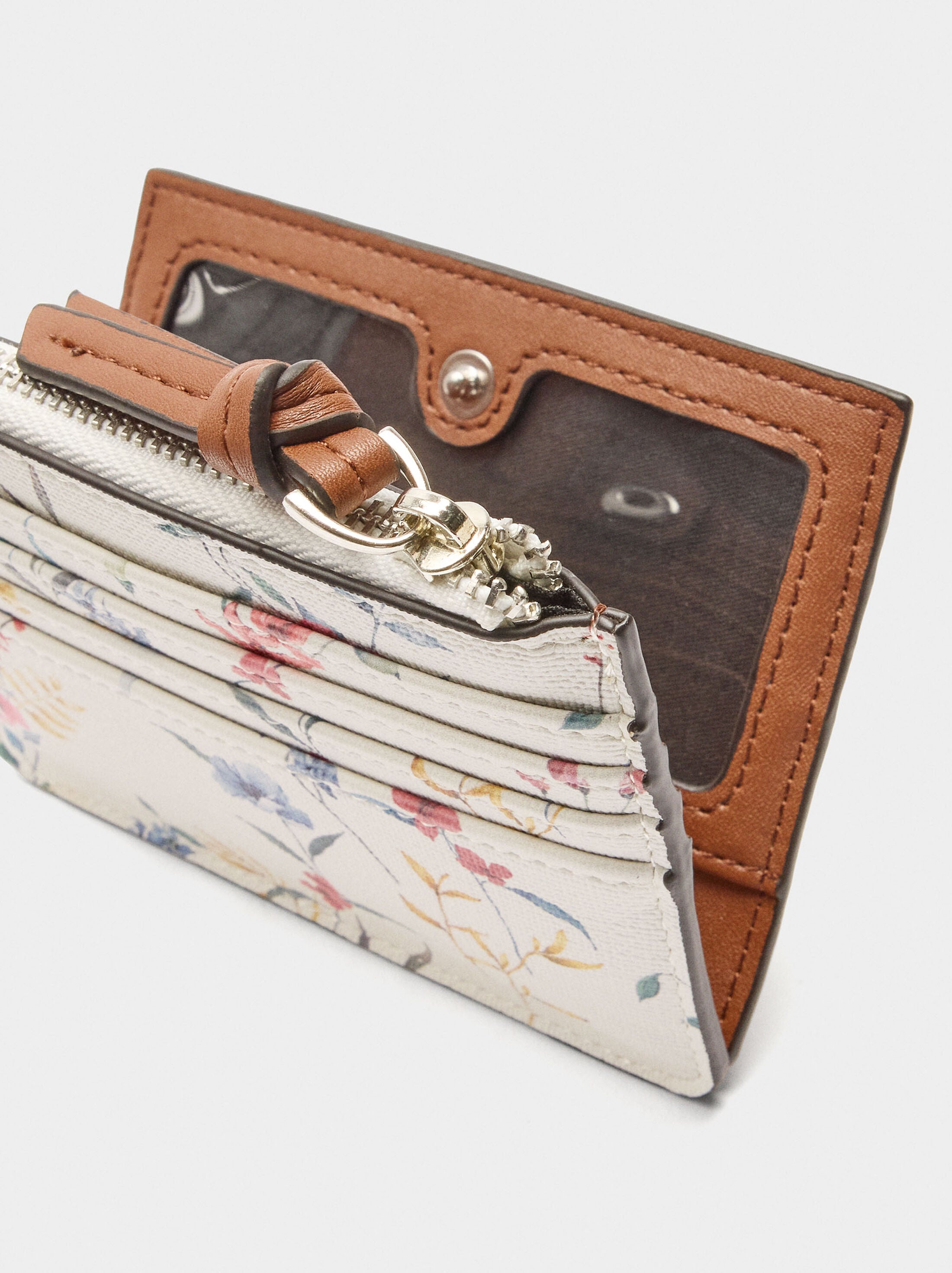 Tarjetero de estampado floral. División con ranuras y cierre de botón de presión. Ranuras exteriores. Compartimento con cierre de cremallera.