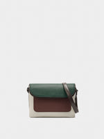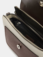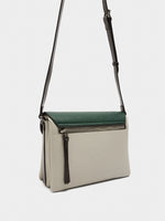 Bolso bandolera color block con textura. Tamaño mediano. Forro y bolsillo interior. Tres divisiones. Bolsillo exterior. Cierre de cremallera y solapa imantada. Asa bandolera fija y ajustable.
