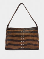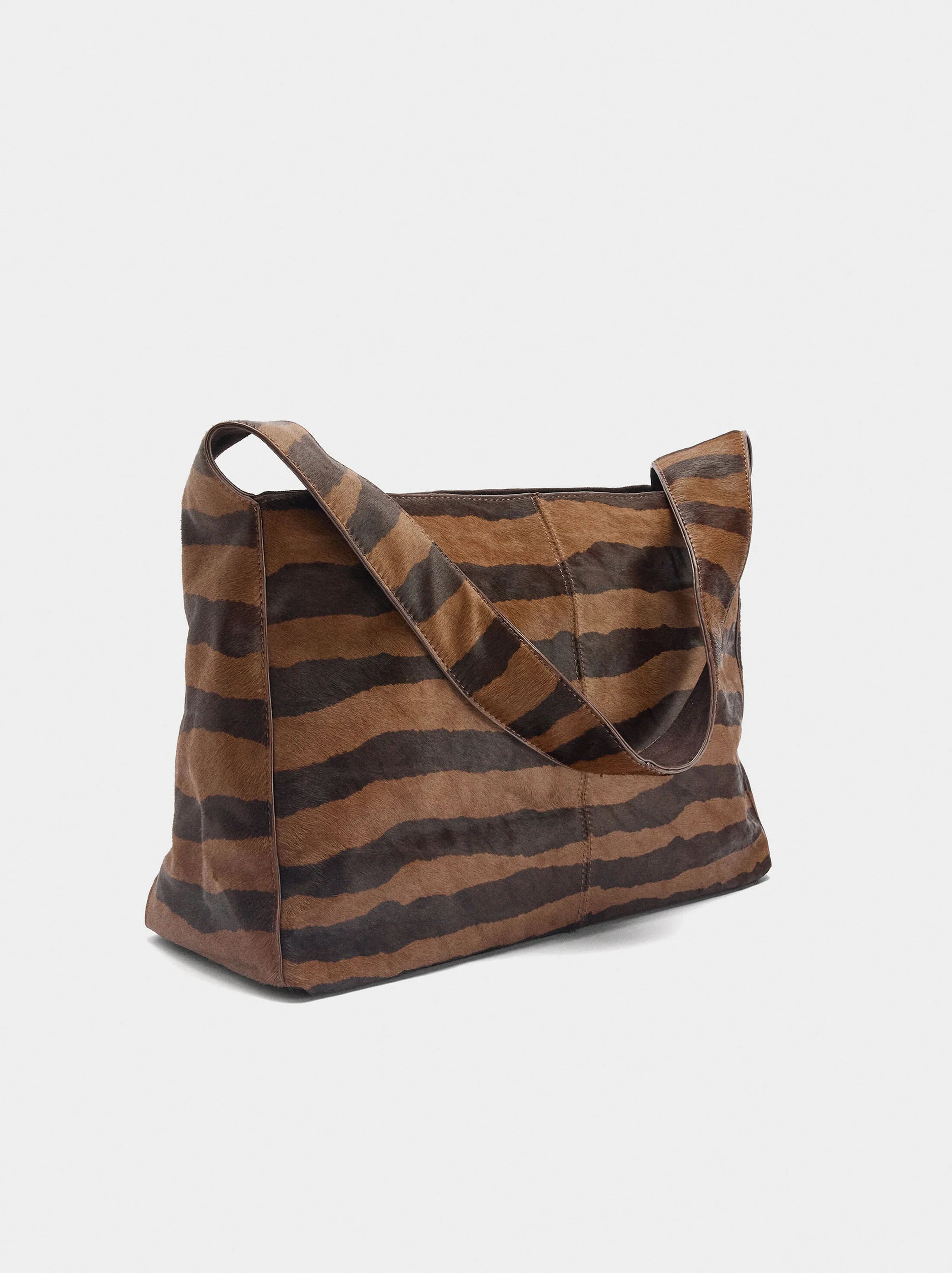 Bolso de mano grande de piel con pelo, estampado animal y tachuelas. Forro y bolsillo interior. Cierre de cremallera. Asa de hombro fija.