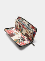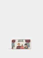 Cartera grande y estampada, con textura. Ranuras para tarjetas y billetes. Compartimento para monedas. Cierre de cremallera.