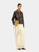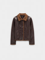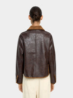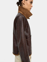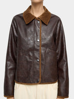 Chaqueta efecto piel. Cuello y bordes en tejido contrastante de bombazina. De manga larga. Bolsillos laterales. Costuras marcadas en la espalda. Cierre con botón de presión. La modelo mide 1,79 m y lleva la talla XS-S.