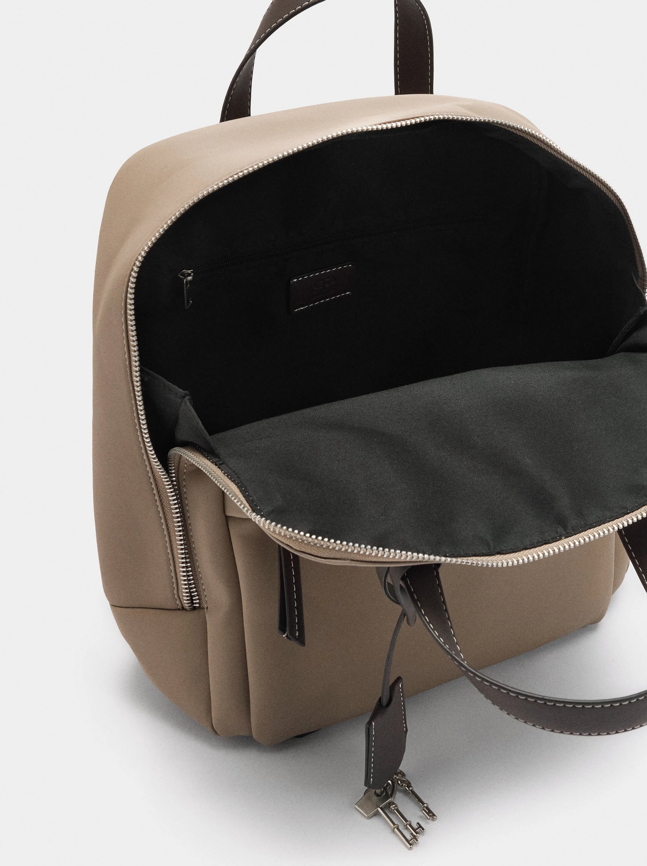 Mochila efecto nylon. Colgante desmontable. Forro y bolsillo interior. Bolsillos exteriores delanteros y traseros con cremallera. Asas de mano fijas Asas traseras ajustables.
