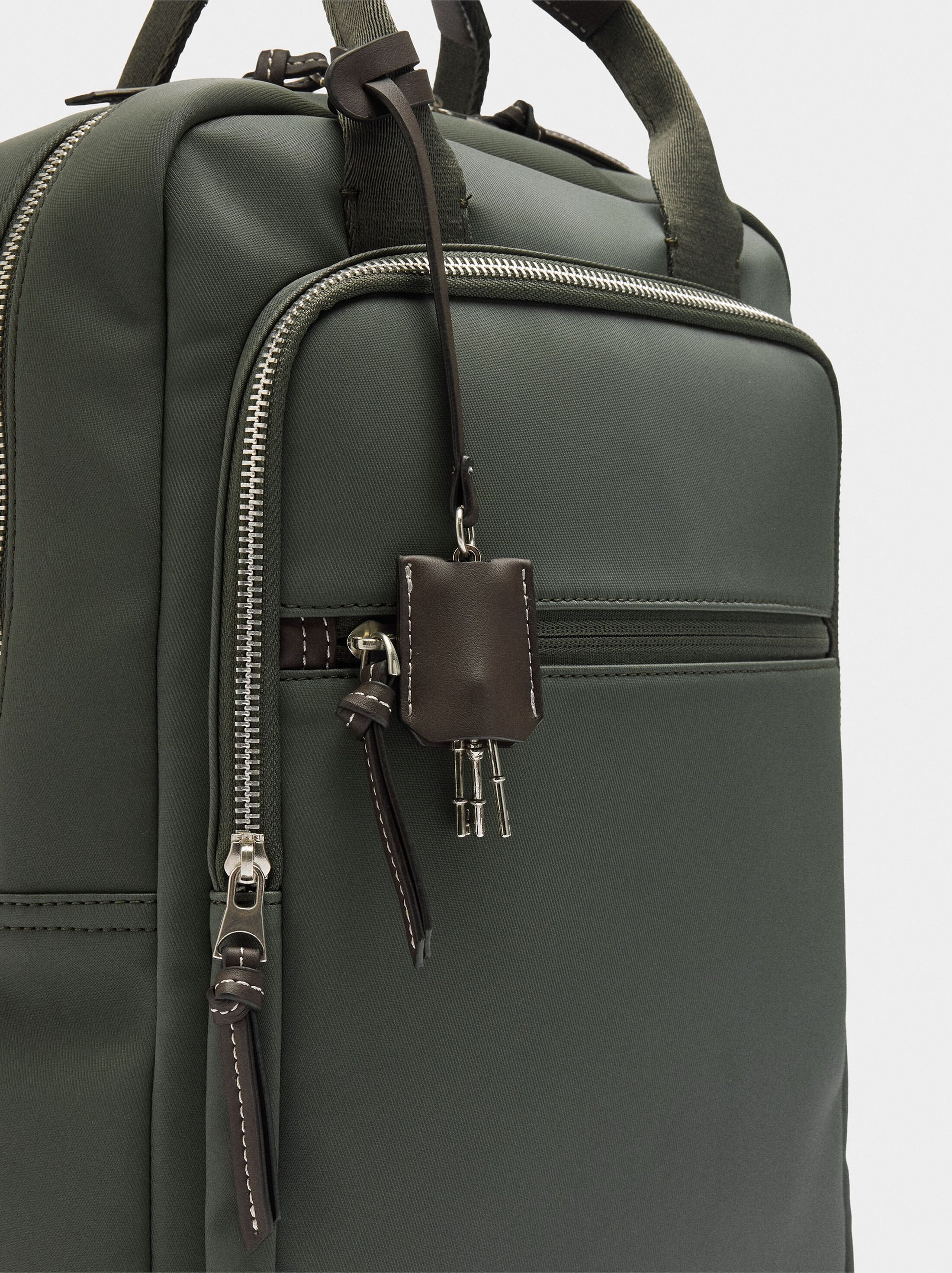 Mochila para portátil de 15" (compartimento trasero) y de 13" (compartimento delantero), con efecto nylon. Colgante extraíble. Forro y bolsillo interior. Compartimento para el portátil. Bolsillos exteriores delanteros y traseros con cierre de cremallera.