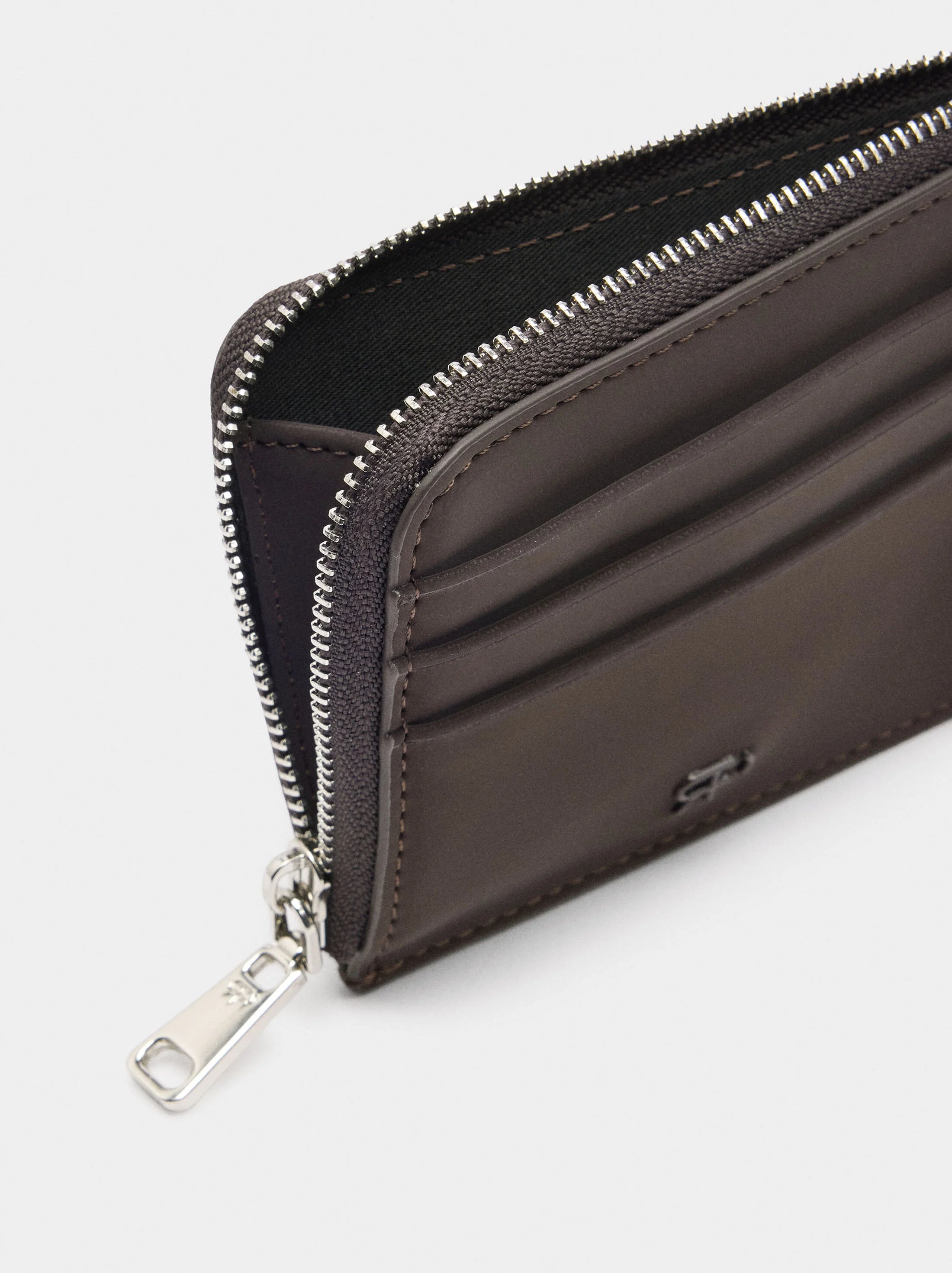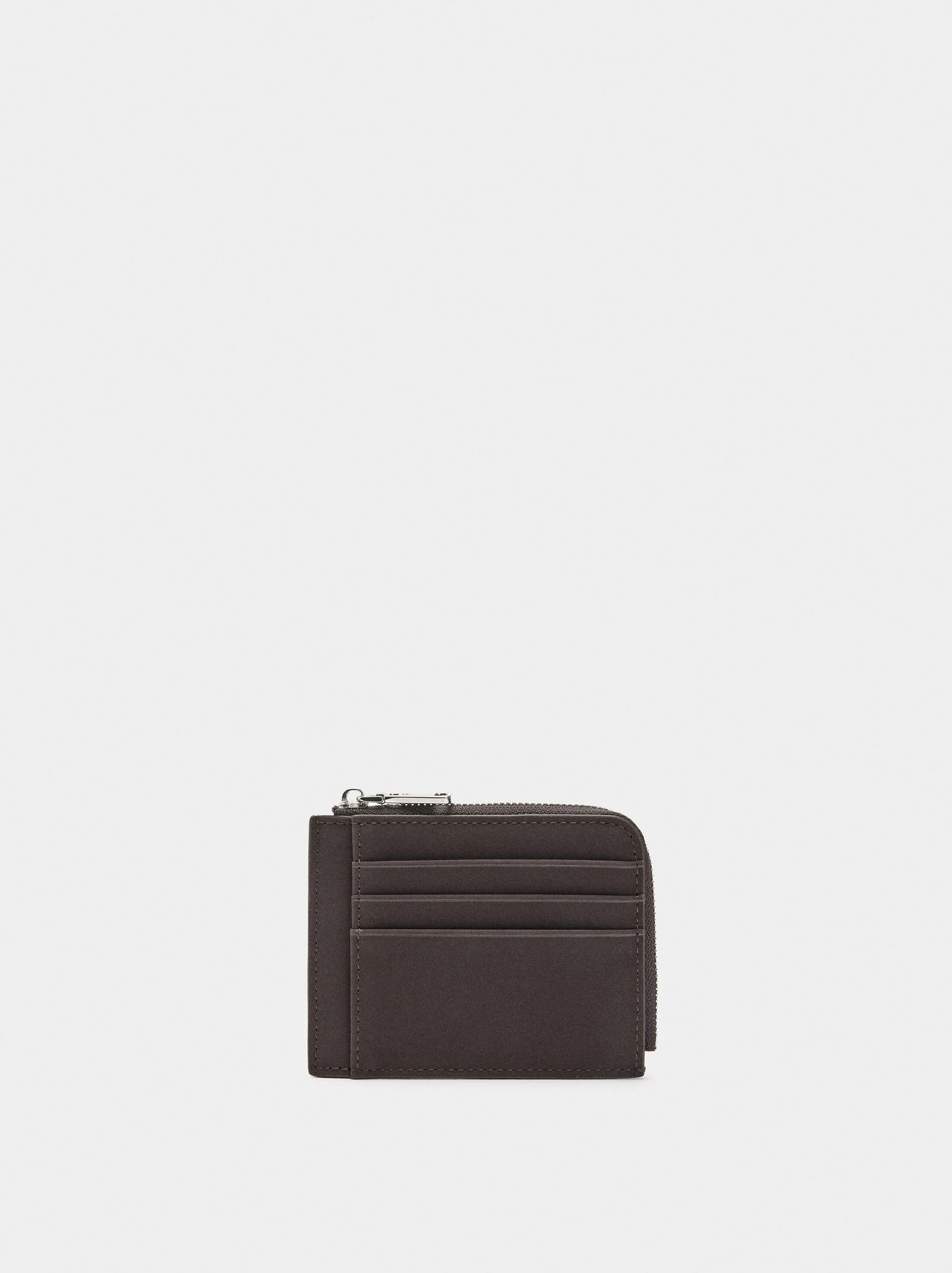 Tarjetero básico de textura suave. Compartimento con cremallera. Forro interior.