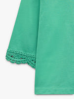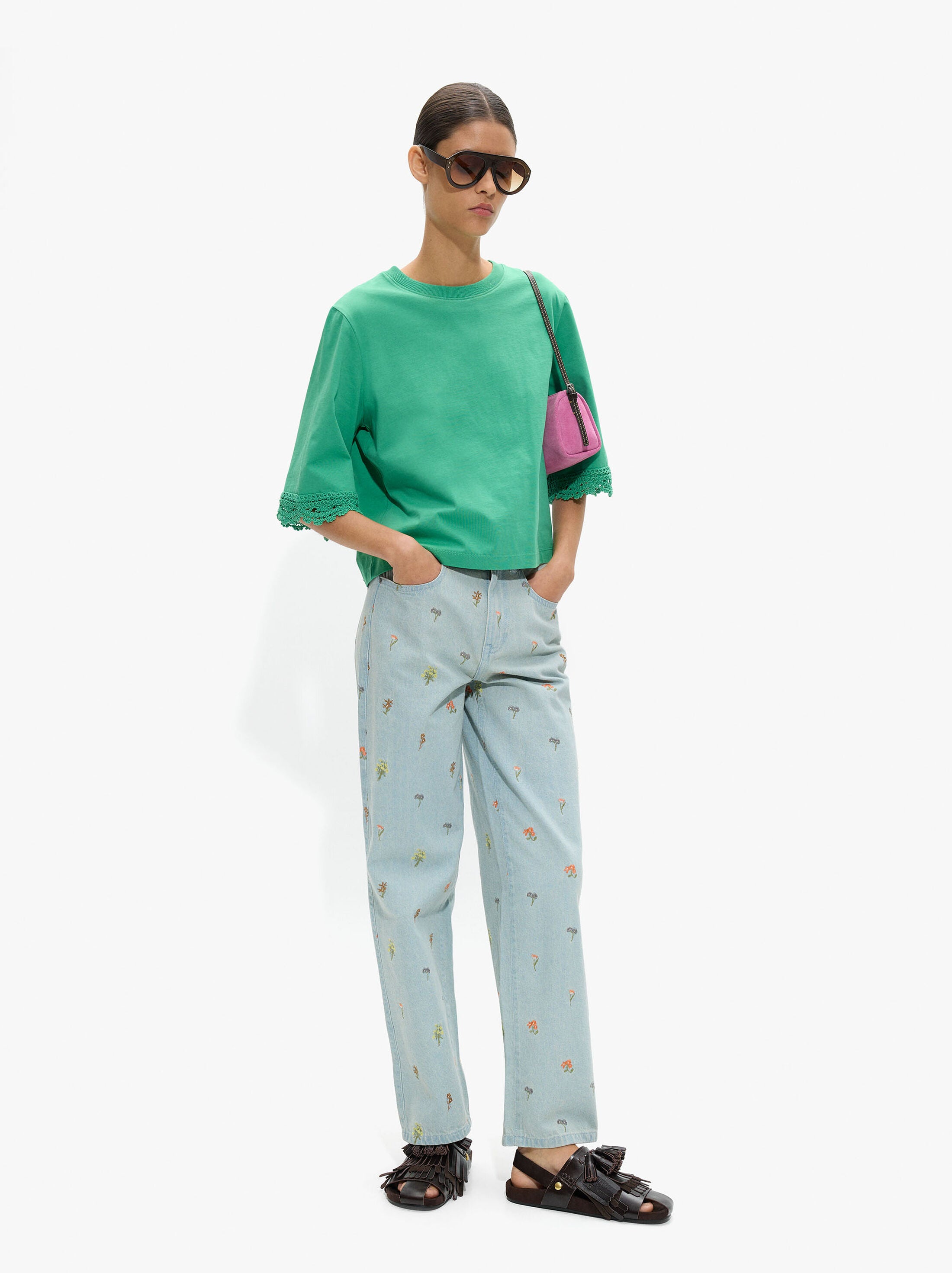 Blusa lisa confeccionada con 100% algodón. Cuello redondo. Manga corta con bordes en crochet. La modelo mide 1,76 m y lleva la talla XS-S.