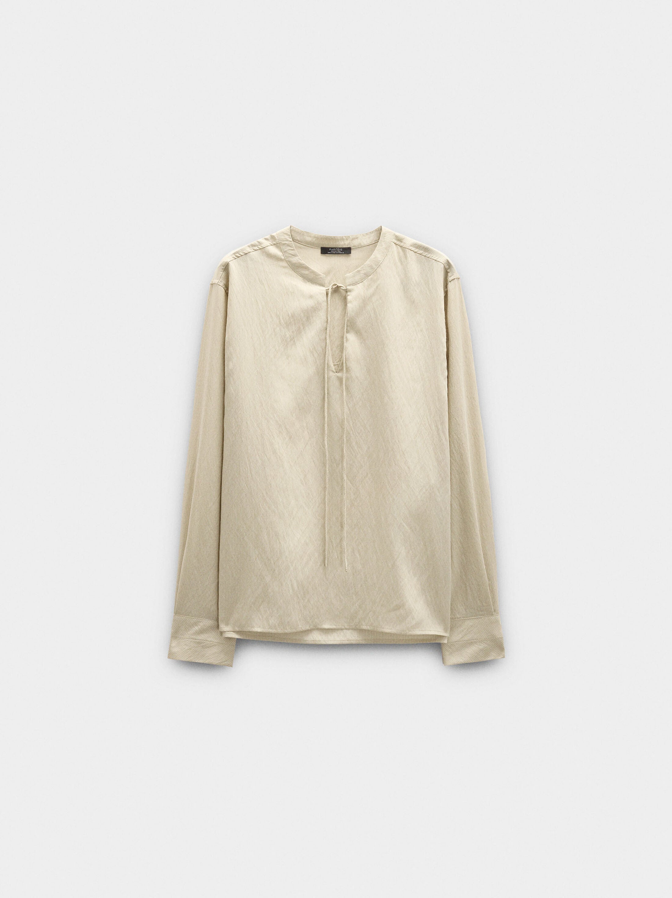 Camisa de rayas manga larga. Cuello mao con cordones. Cierre con botones en los puños. La modelo mide 1,80 m y lleva la talla S.