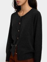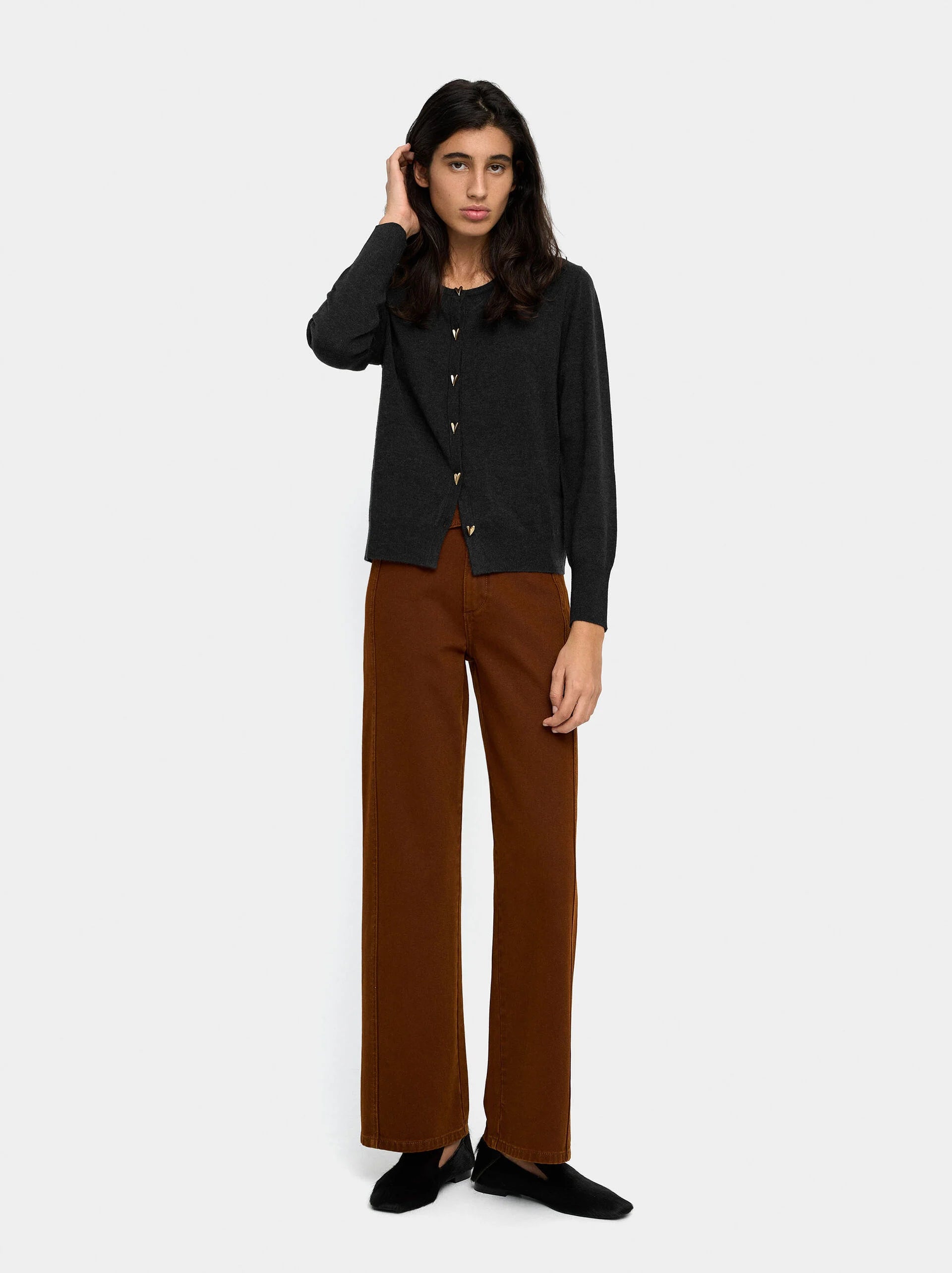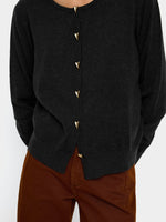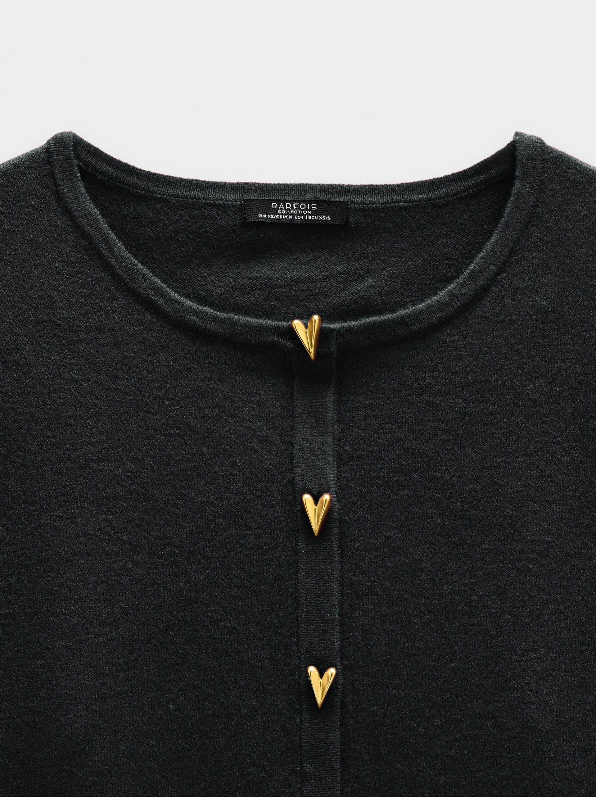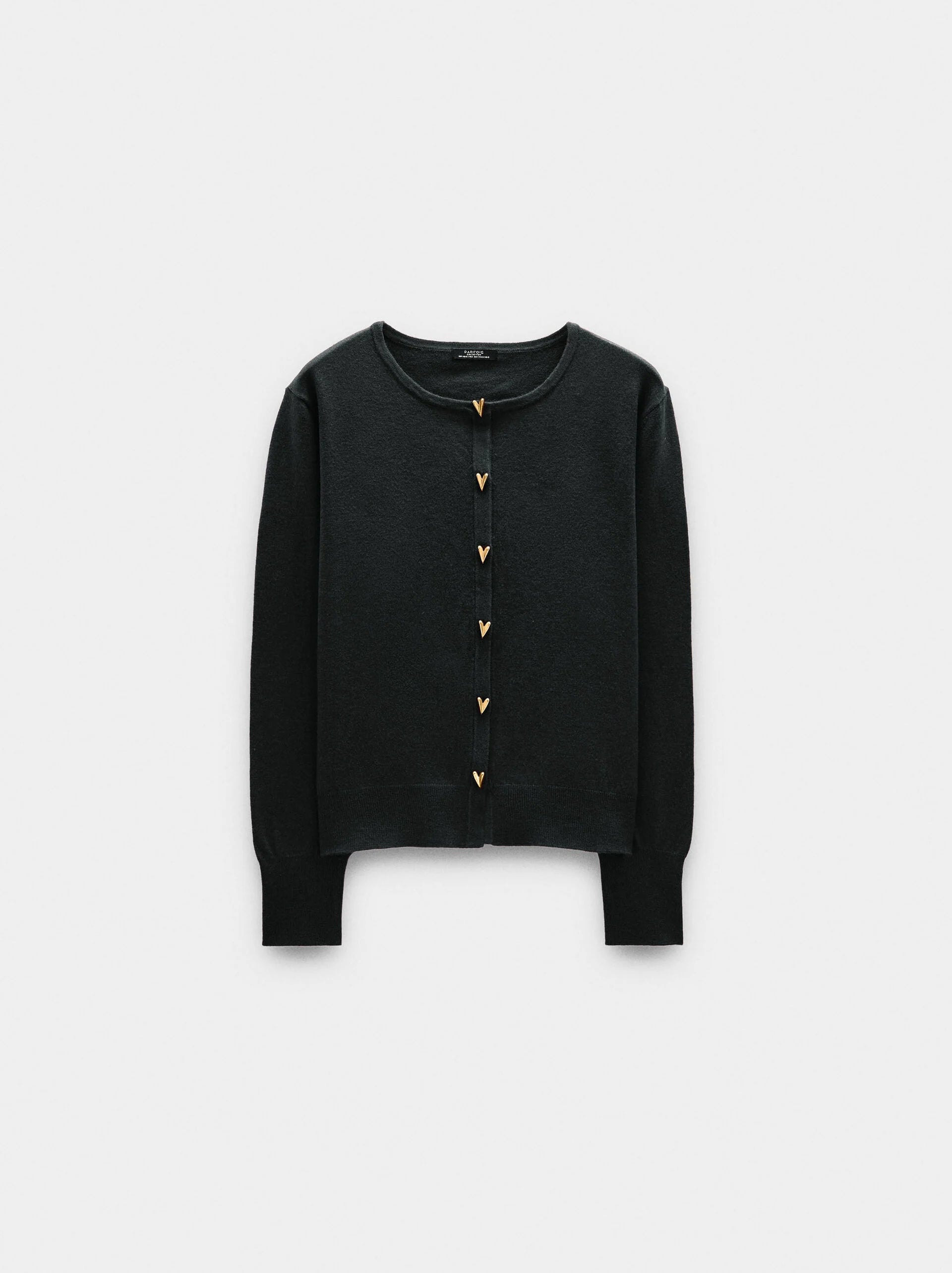 Cárdigan de punto con botones en forma de corazones. Cuello redondo. Manga larga. Bajo y puños canalados. La modelo mide 1,77 m y lleva la talla XS-S.