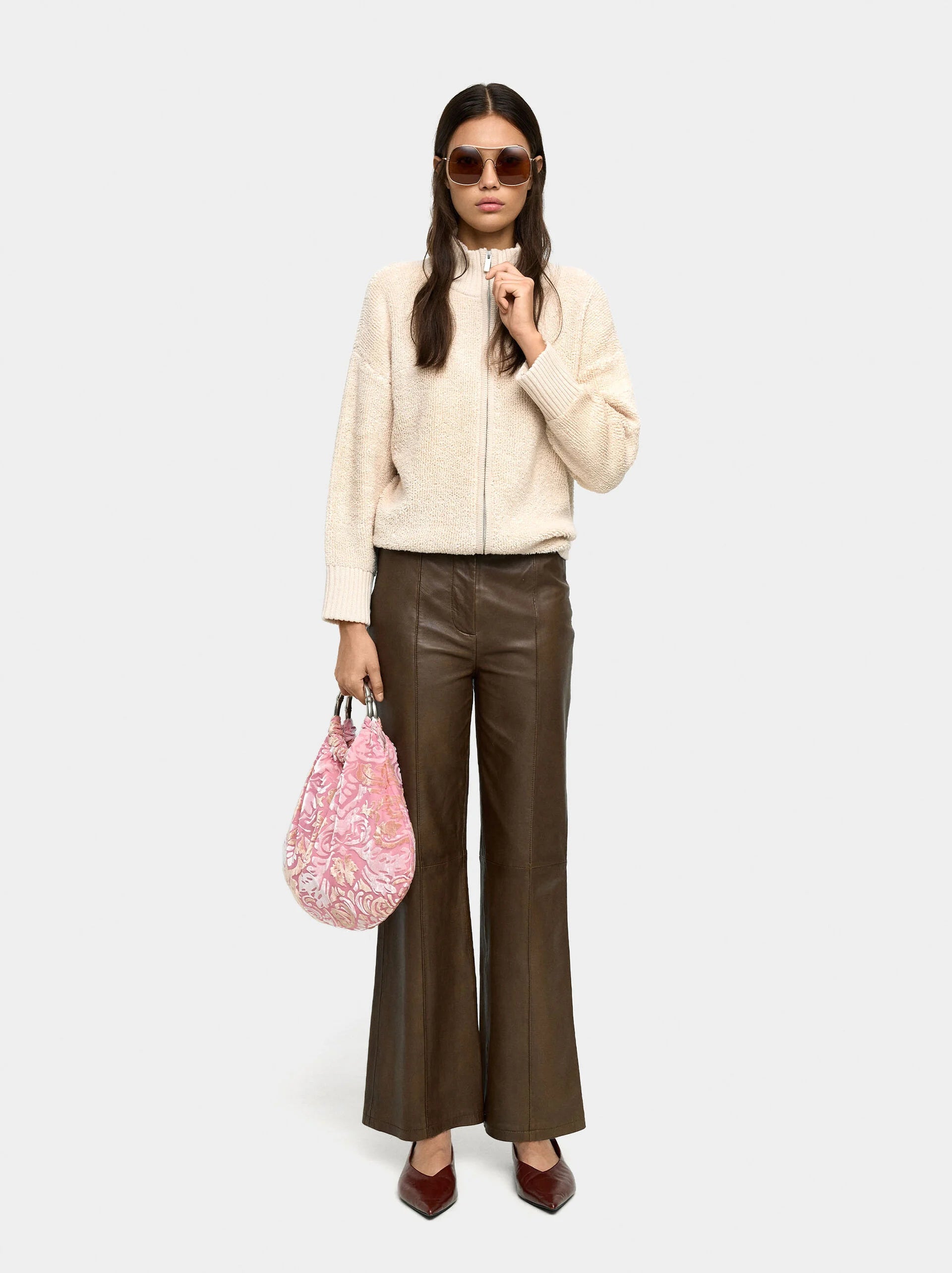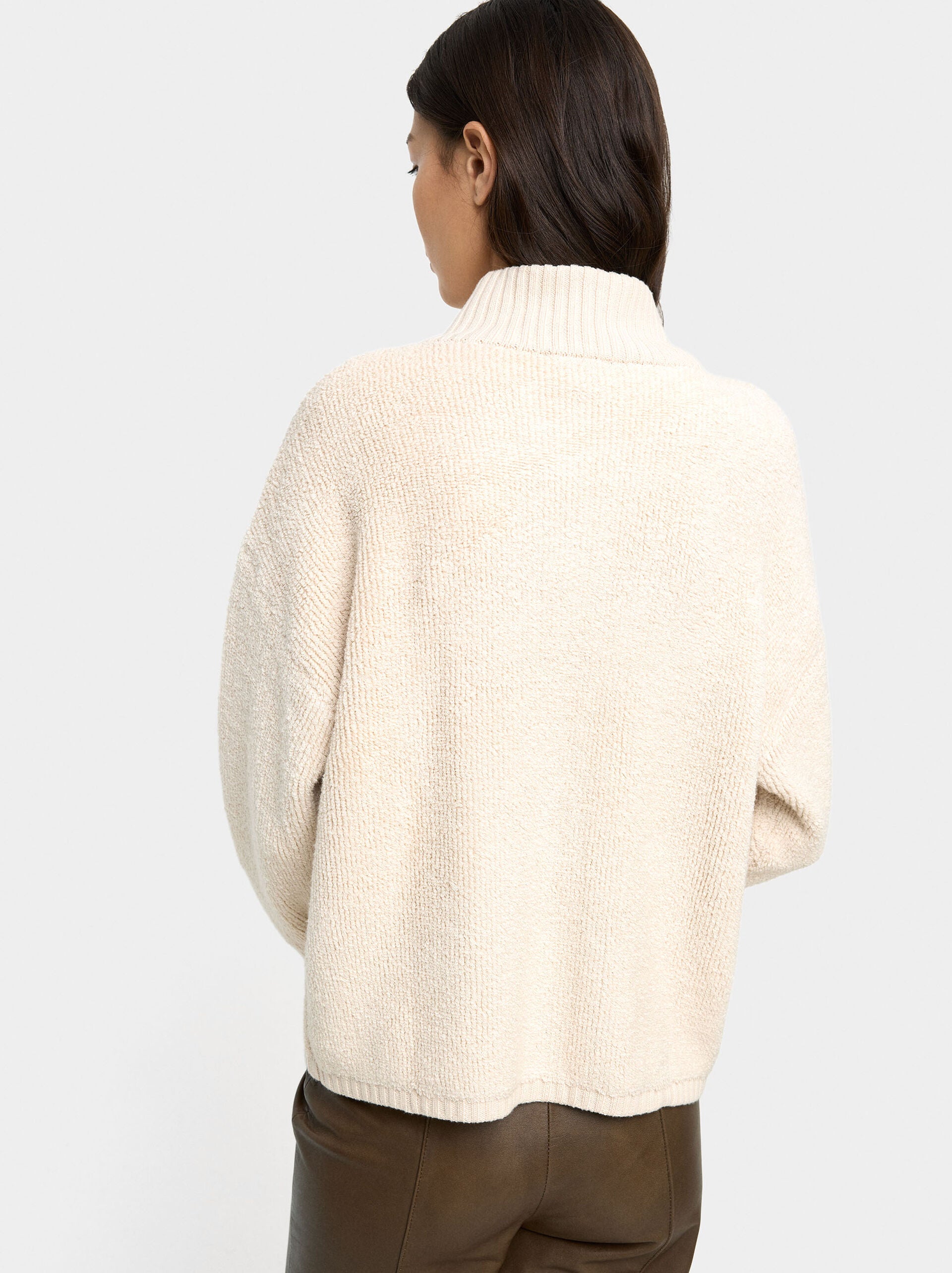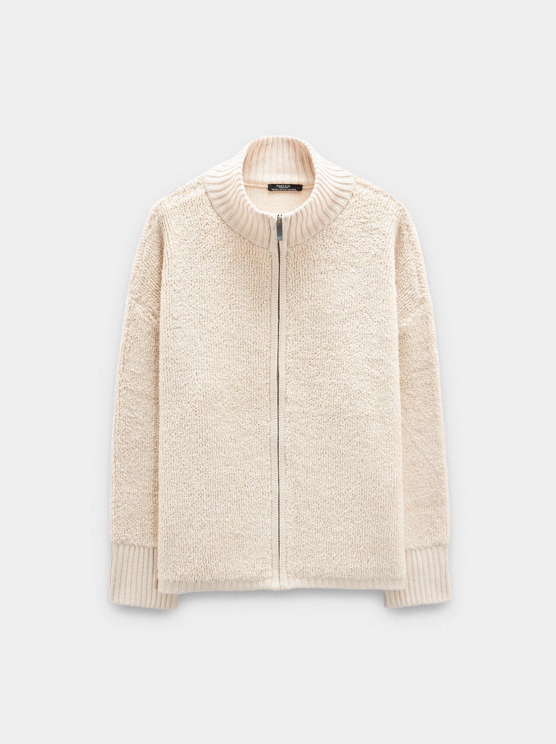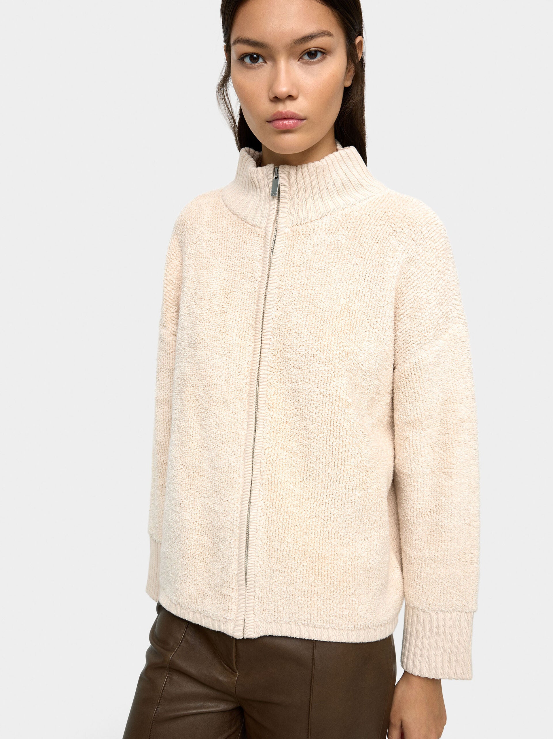 Cárdigan de punto con textura. Cuello alto. Manga larga caída. Bordes canalados. Abertura con cierre de cremallera. La modelo mide 1,80 m y lleva la talla XS-S.