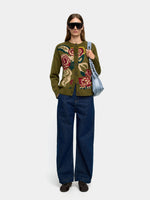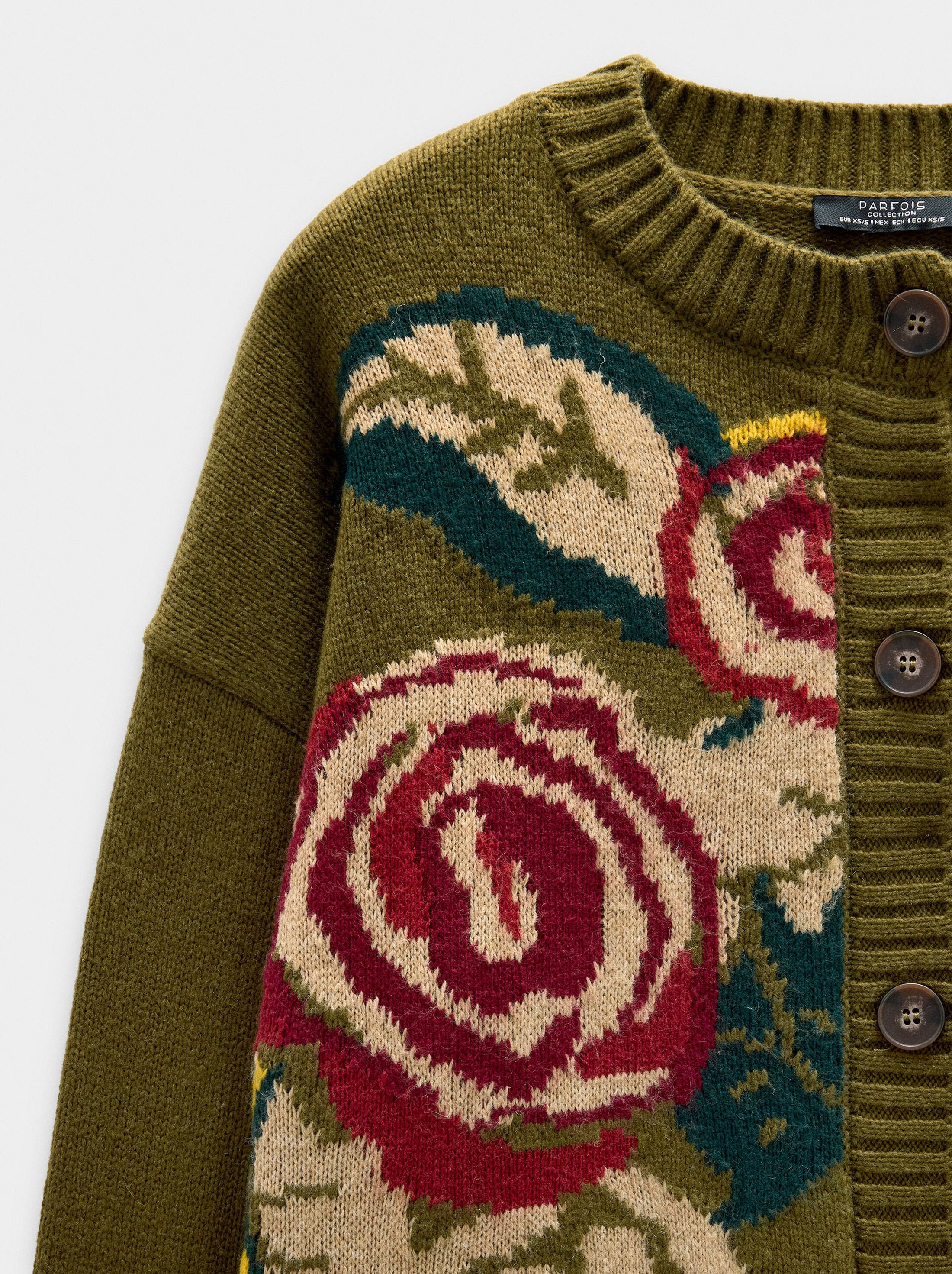 Cárdigan de punto jacquard con diseño floral. Cuello redondo. Manga larga. Bordes canalados. Cierre con botones. La modelo mide 1,79 m y lleva la talla XS-S.