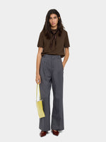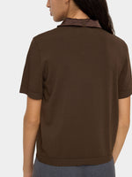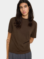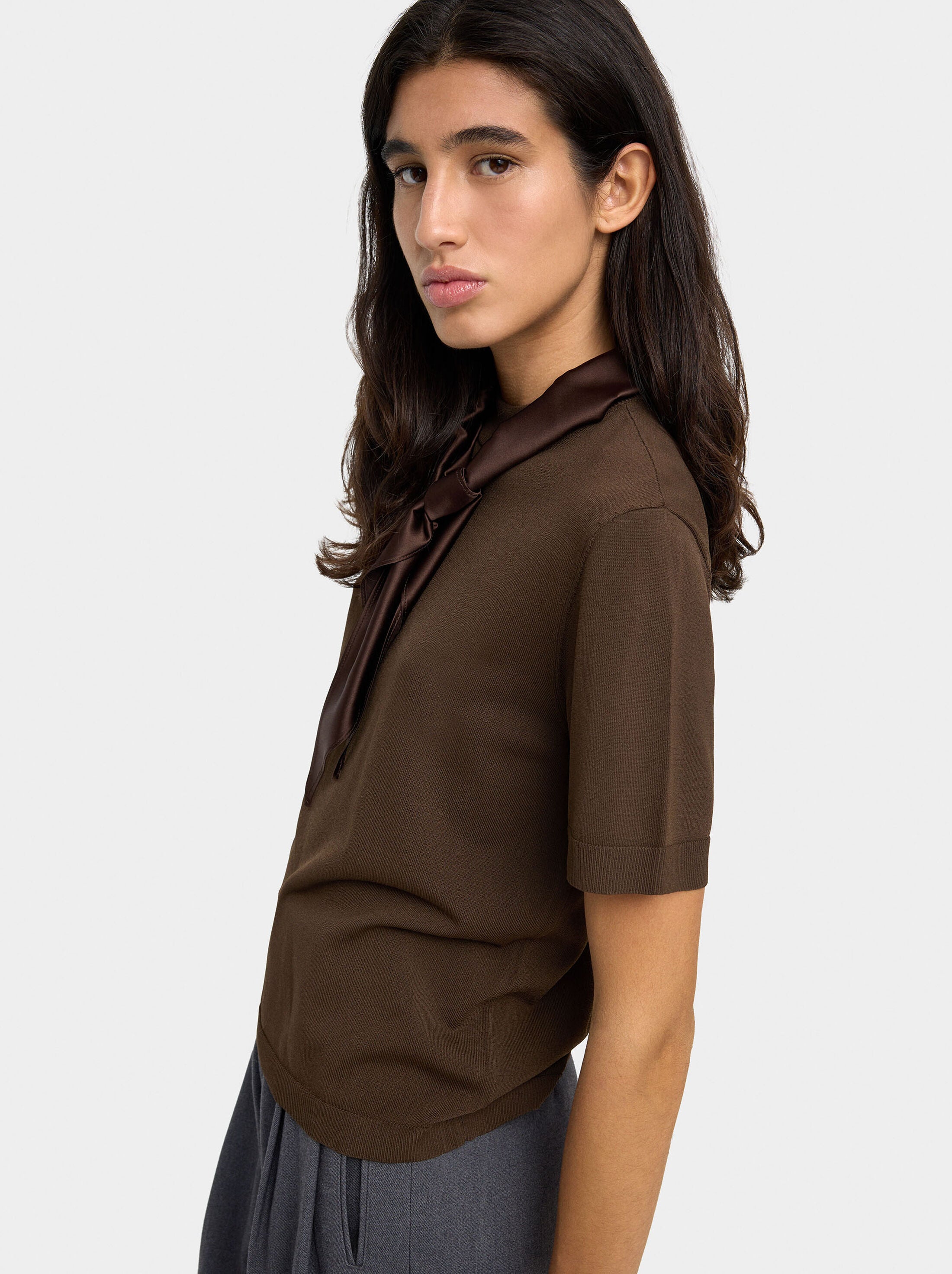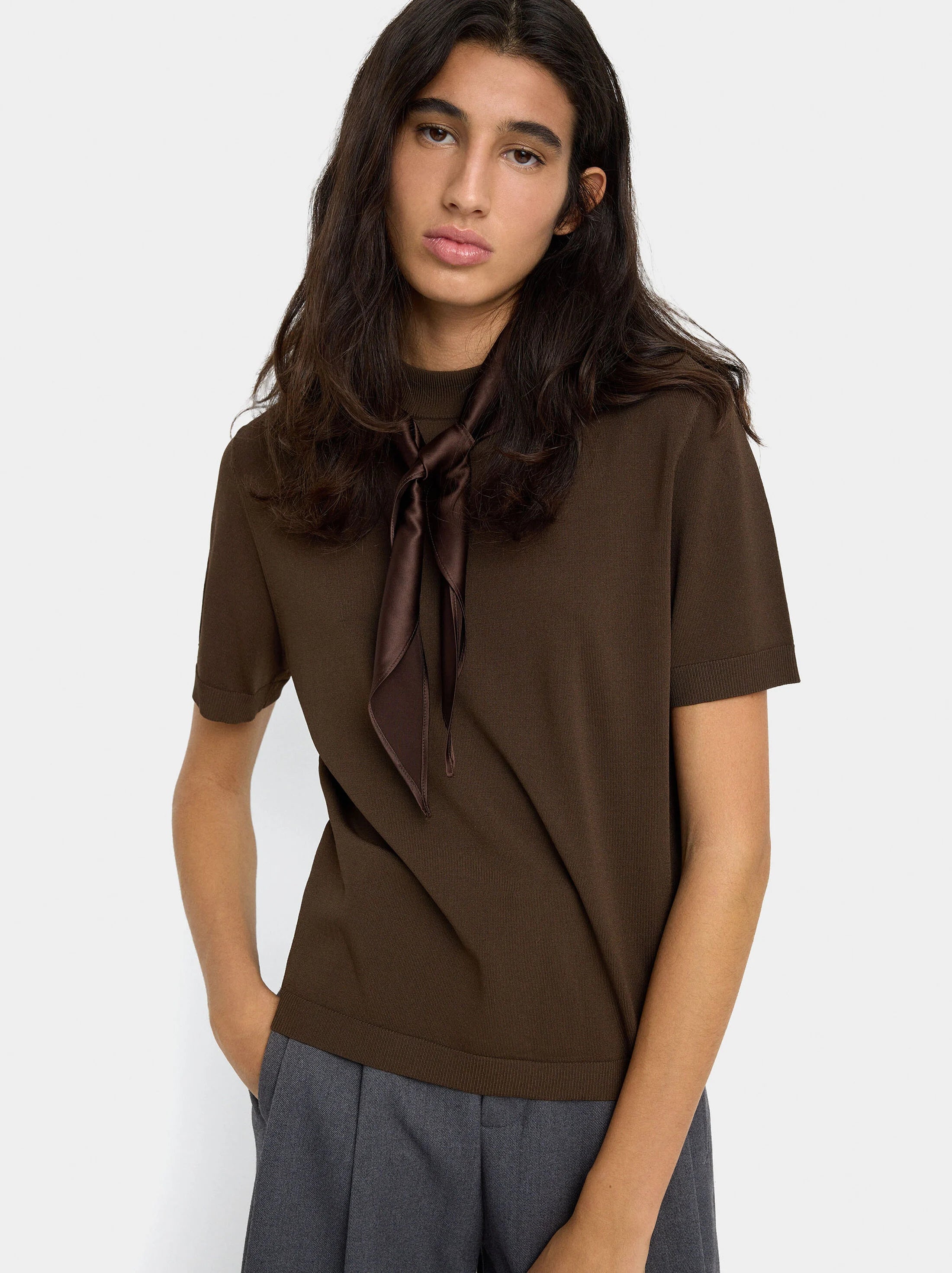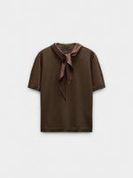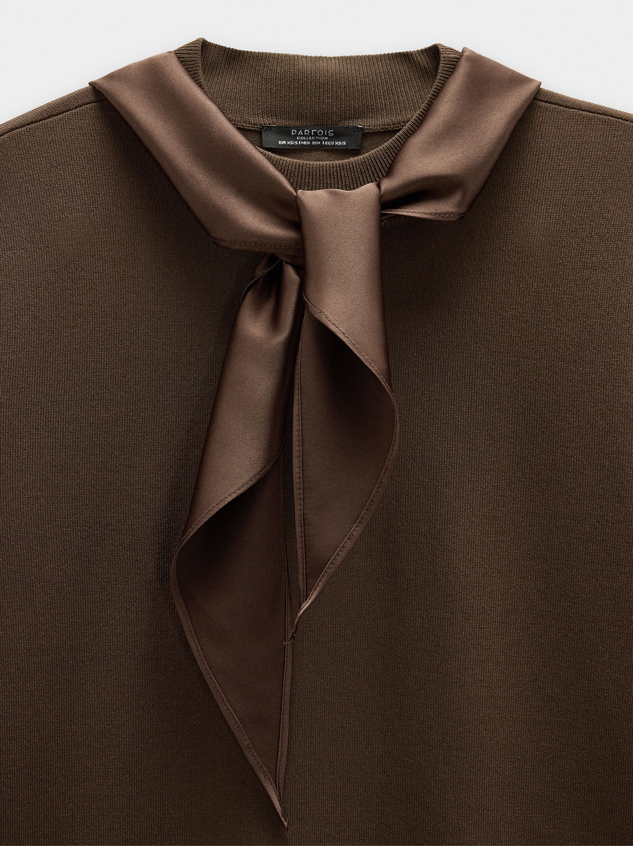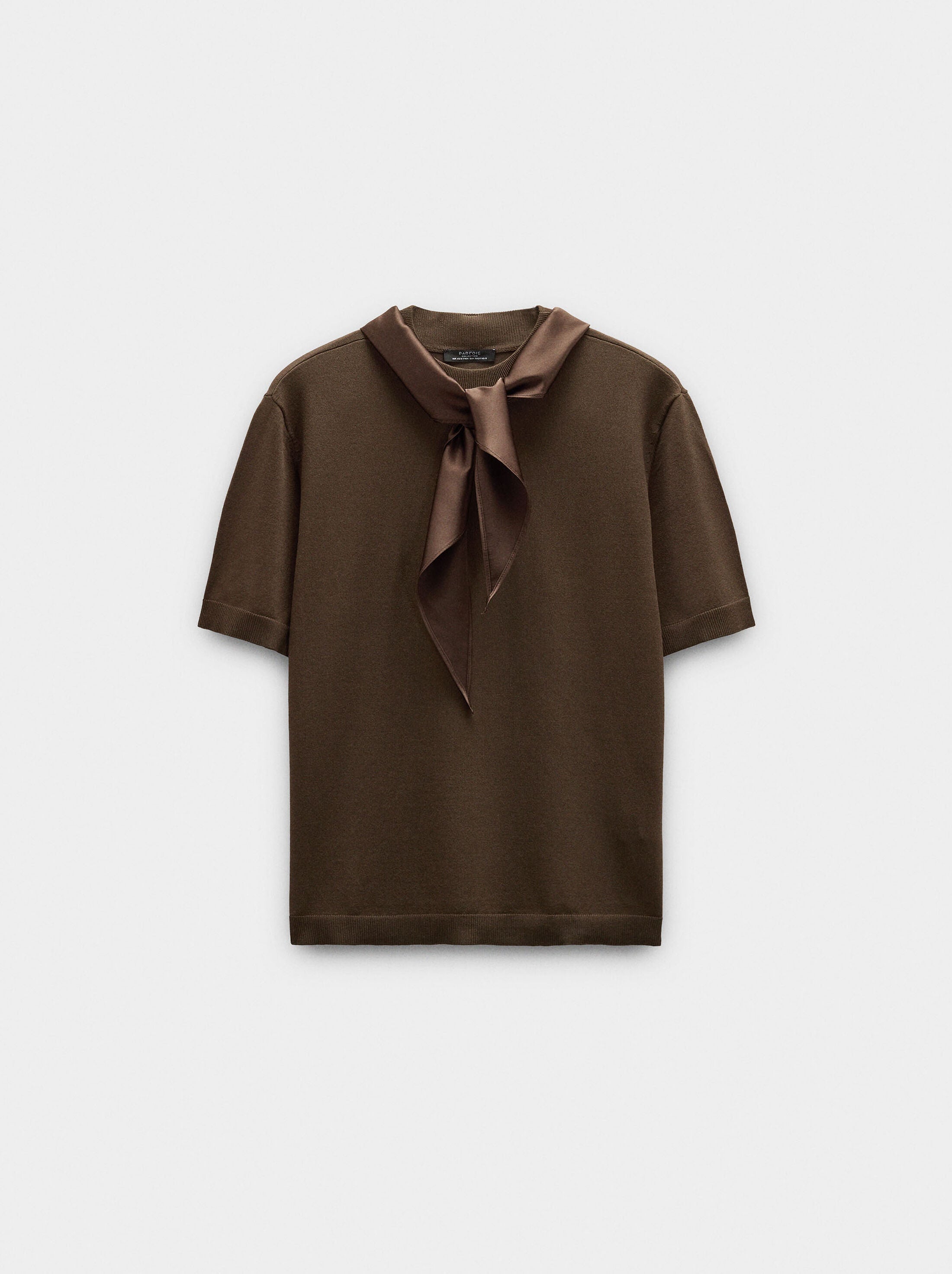 Jersey de punto con detalle de pañuelo satinado. Cuello redondo. Manga corta. Bordes de canalado.