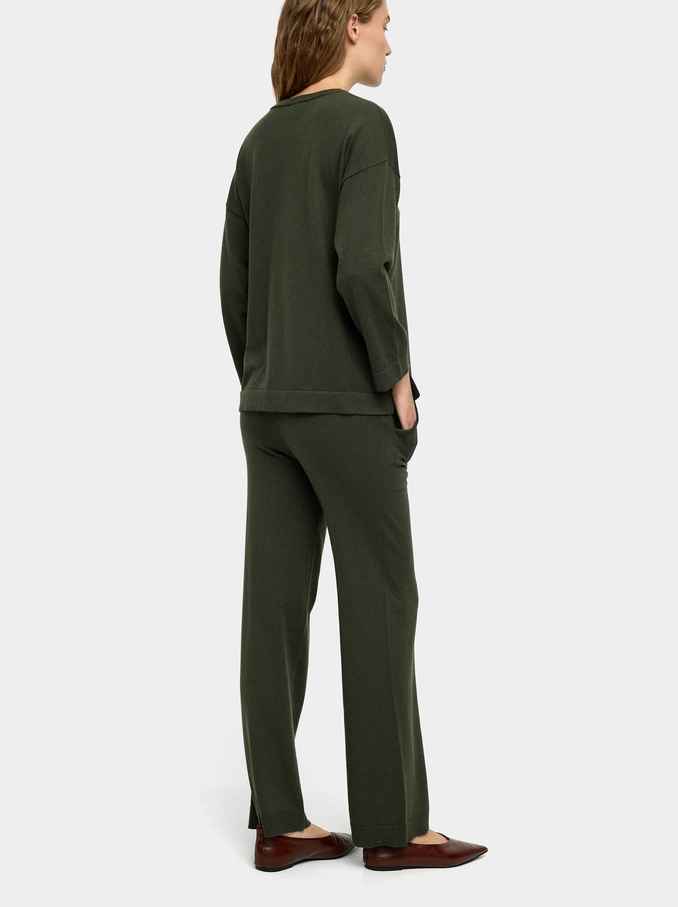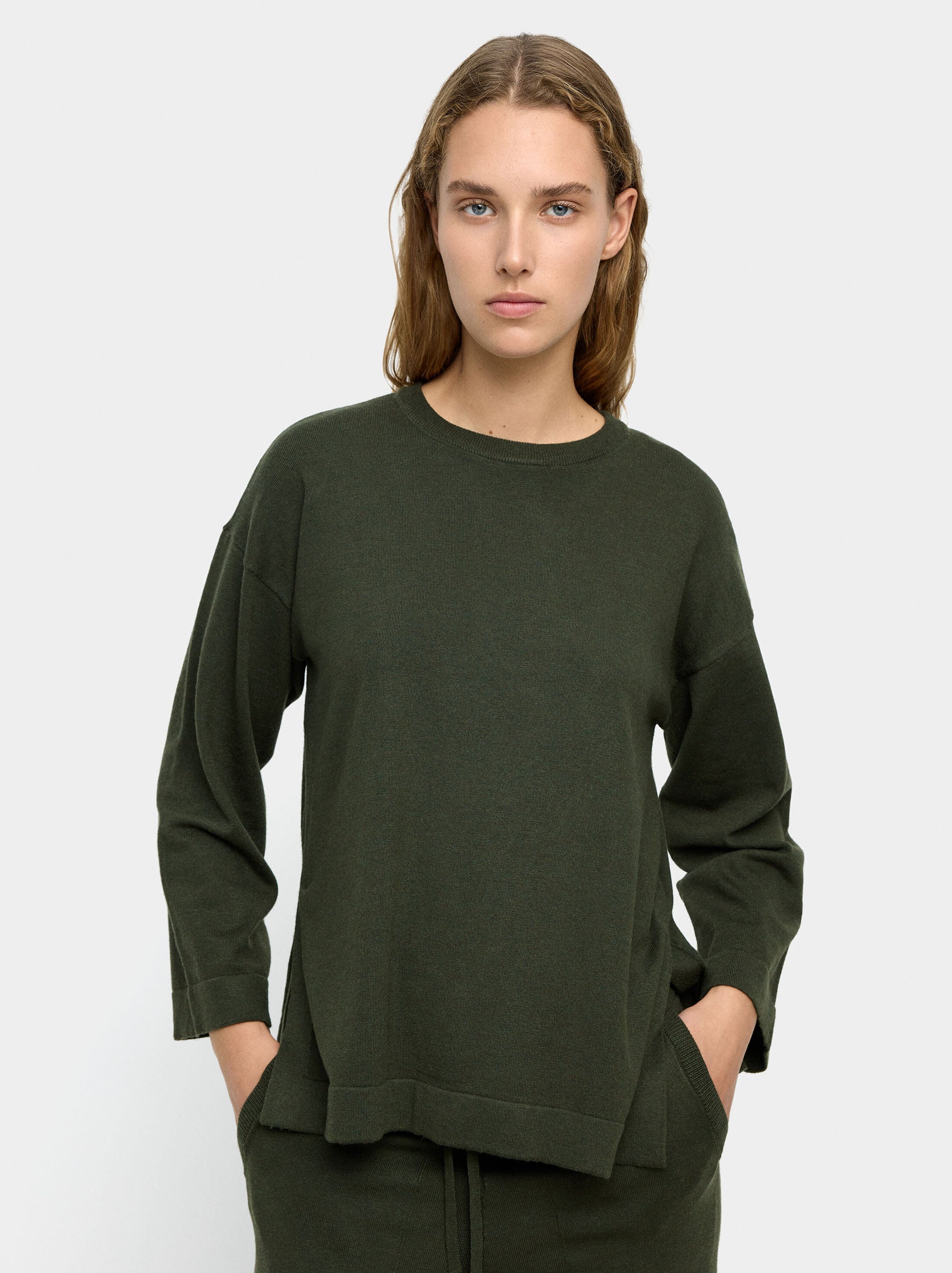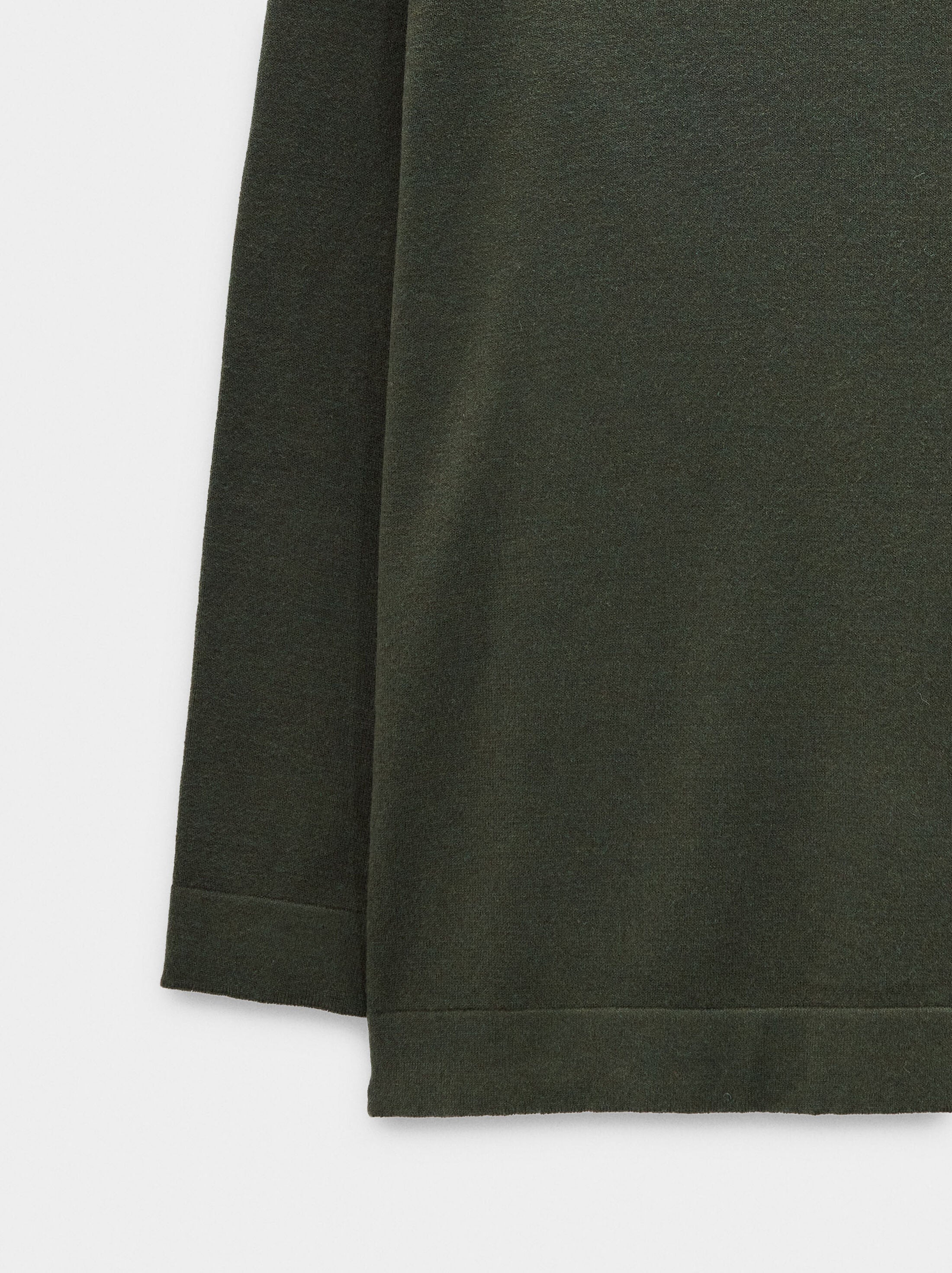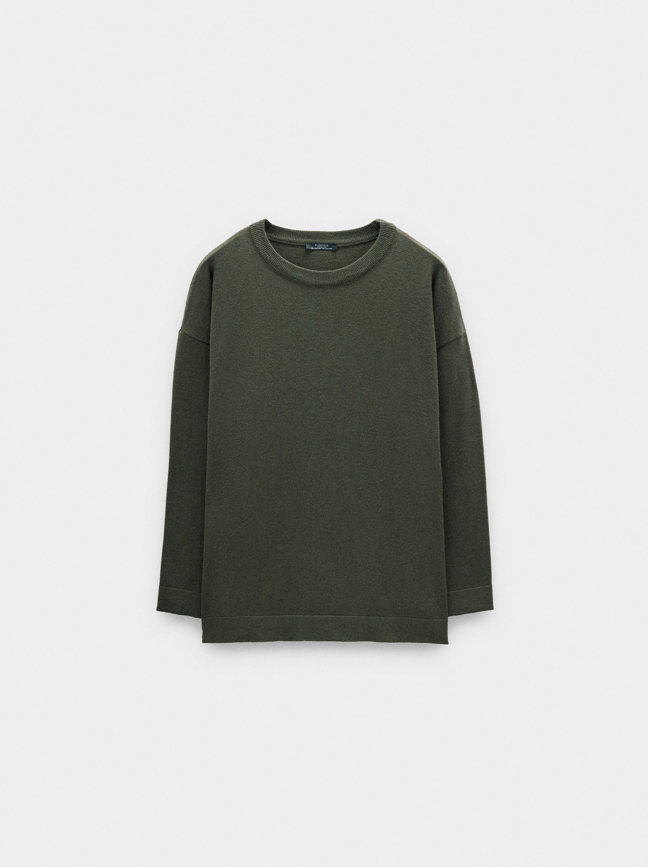 Jersey de punto liso. Cuello redondo canalado. Manga larga. La modelo mide 1,75 m y lleva la talla XS-S.