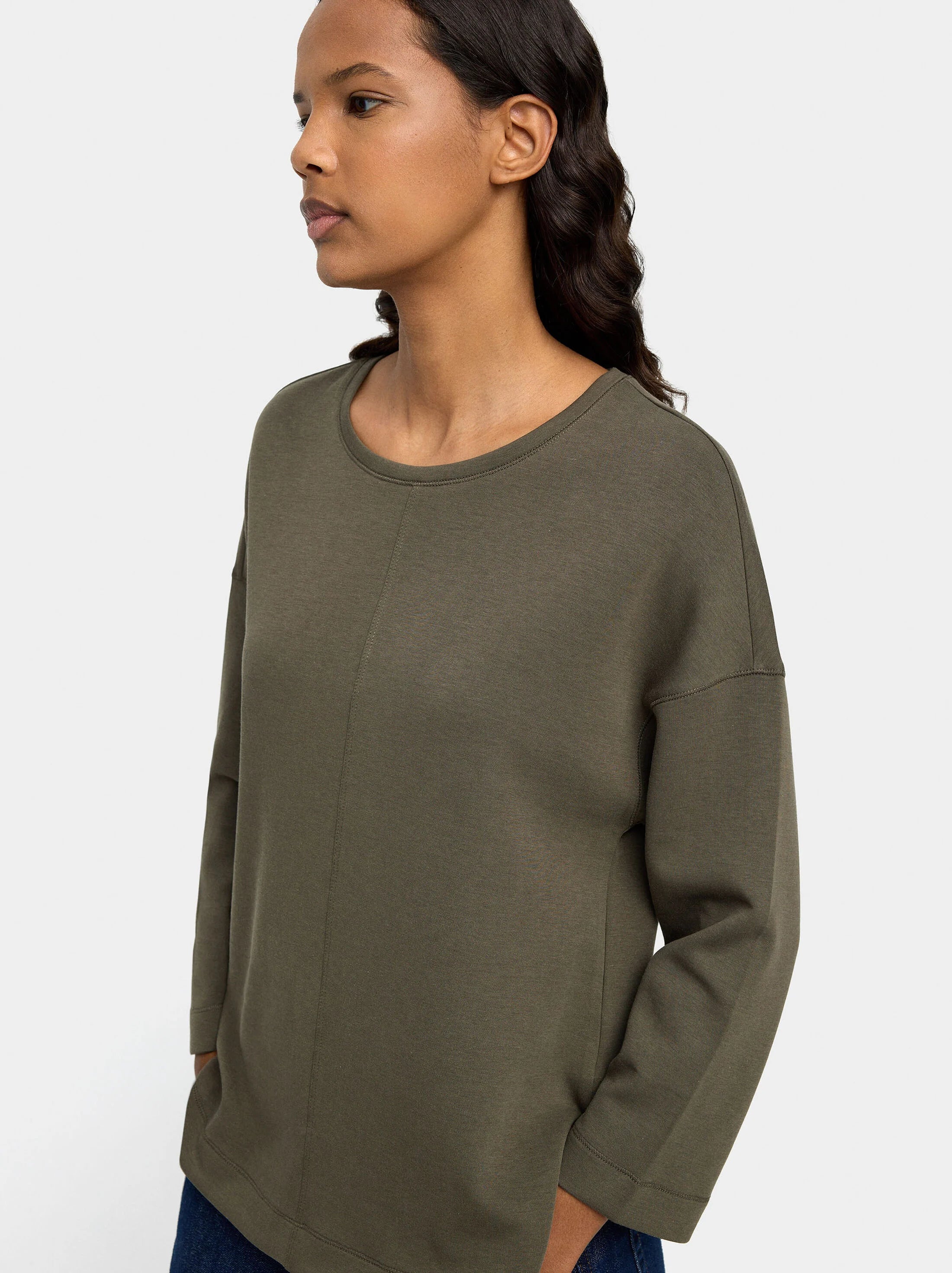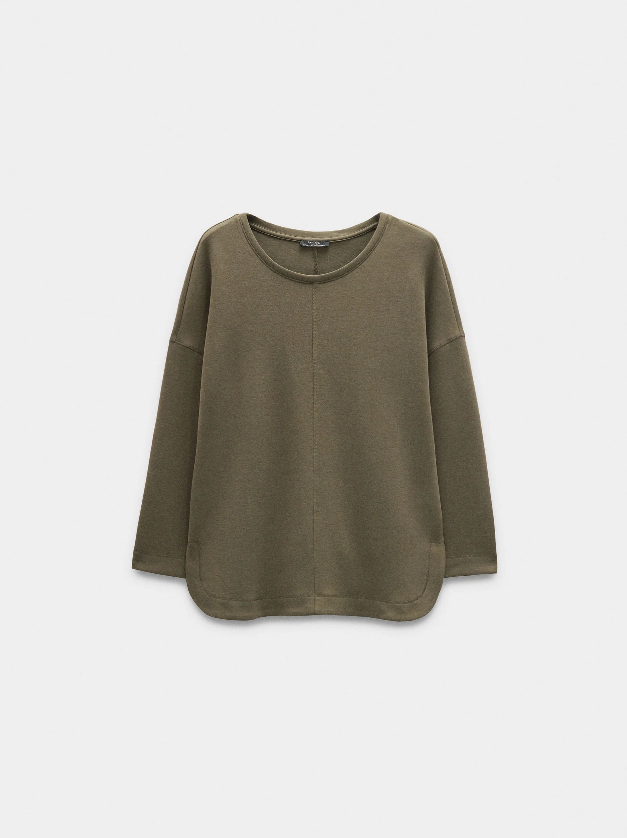 Sudadera básica. Costuras marcadas en el medio, por delante y por detrás. Cuello redondo. Manga larga. Bajo redondeado con aberturas laterales inferiores. La modelo mide 1,79 m y lleva la talla XS-S.