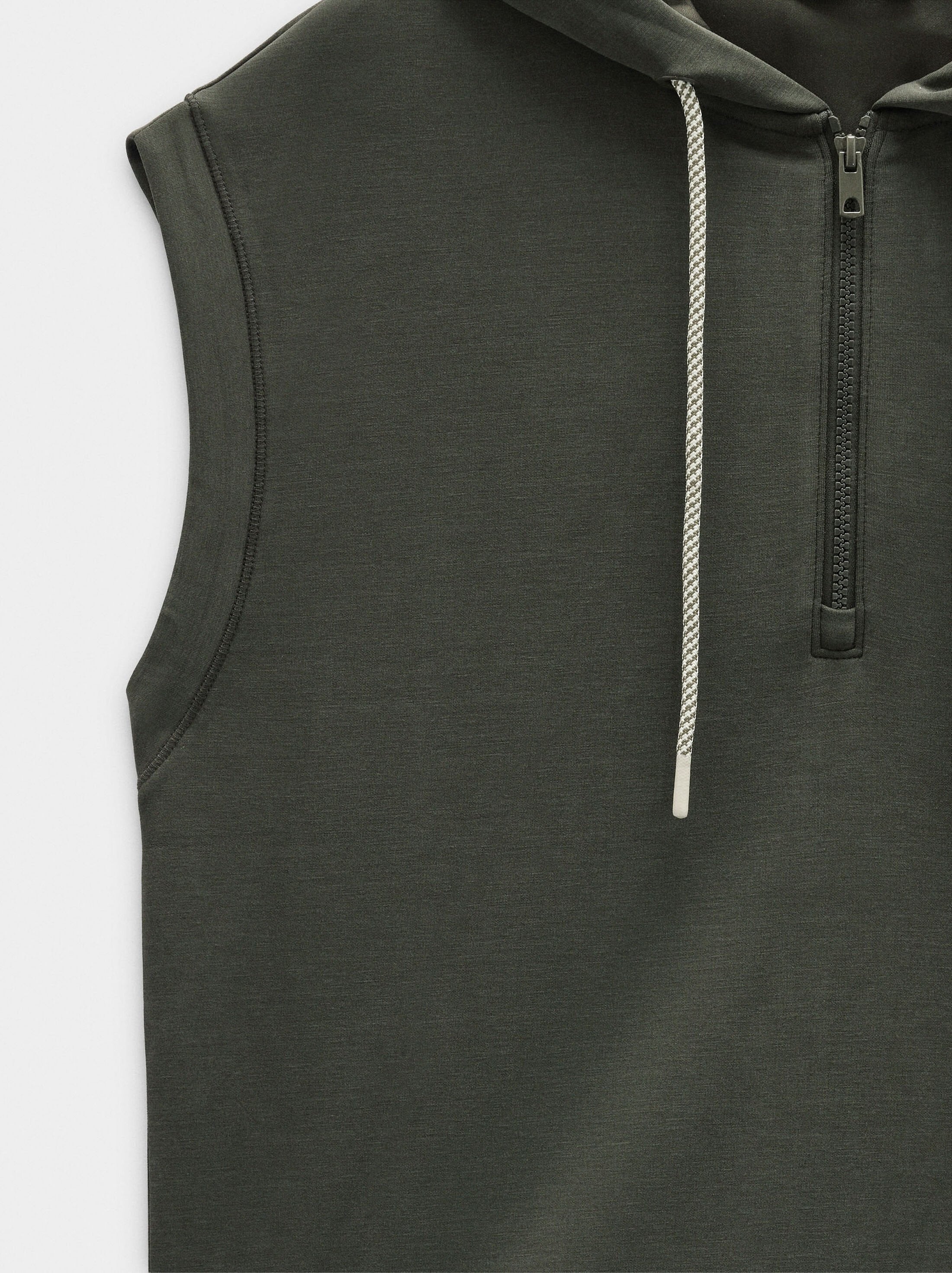 Sudadera sin mangas. Capucha con cordón ajustable. Abertura con cierre de cremallera. Toque suave. La modelo mide 1,80 m y lleva la talla S.