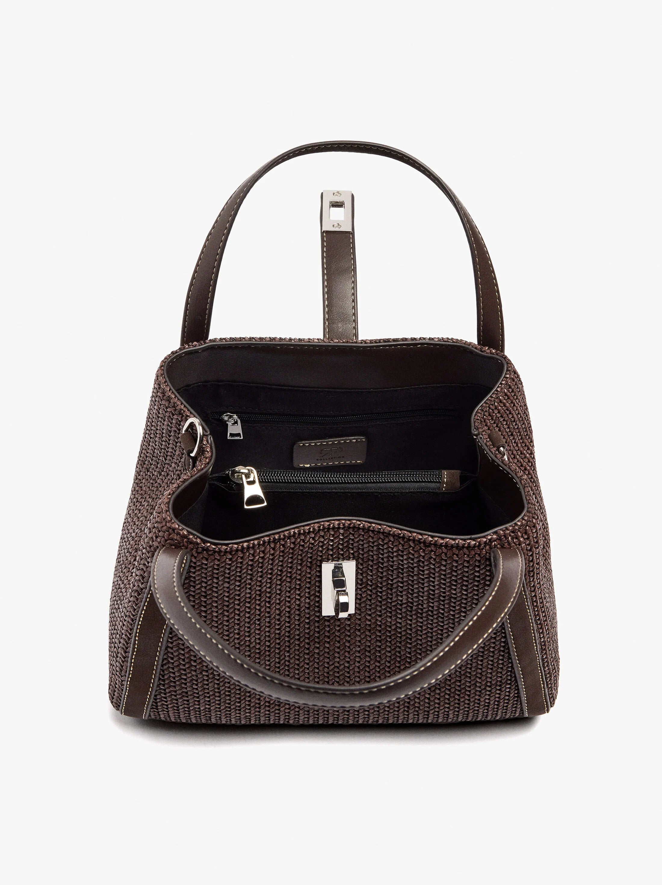 Bolso tote grande con efecto rafia. Forro y bolsillo interior. Compartimento en la parte central. Cierre con botón giratorio y tira. Asas de mano fijas. Bandolera ajustable y desmontable.